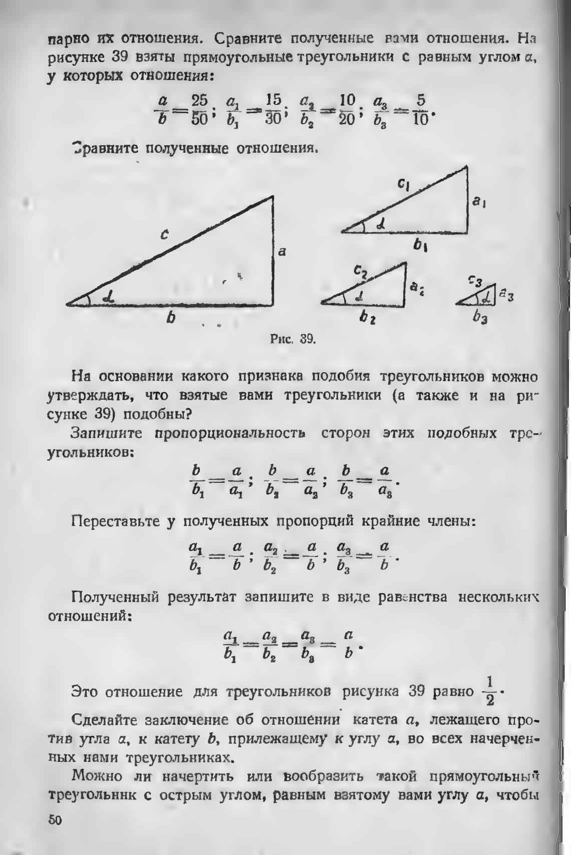 рисунке 39 взяты прямоугольные треугольники с равным углом а,