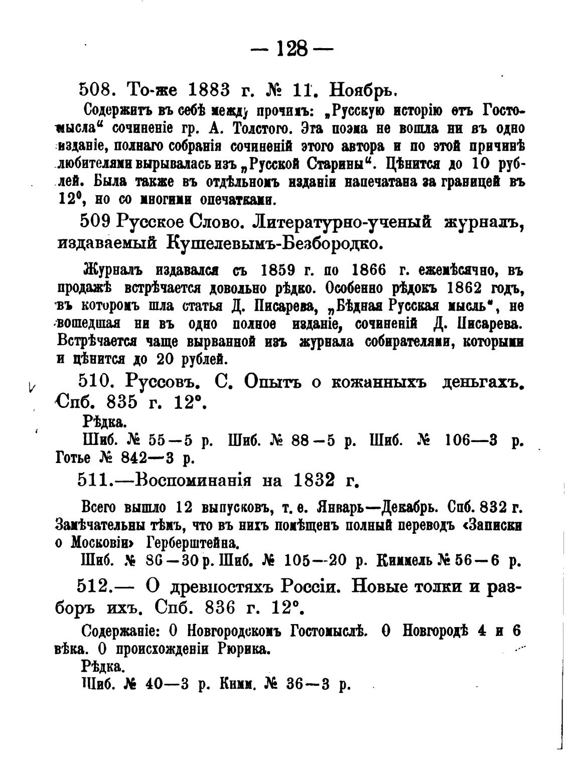 510. Руссовъ. С. Опыть о кожанныхъ деньгахъ.