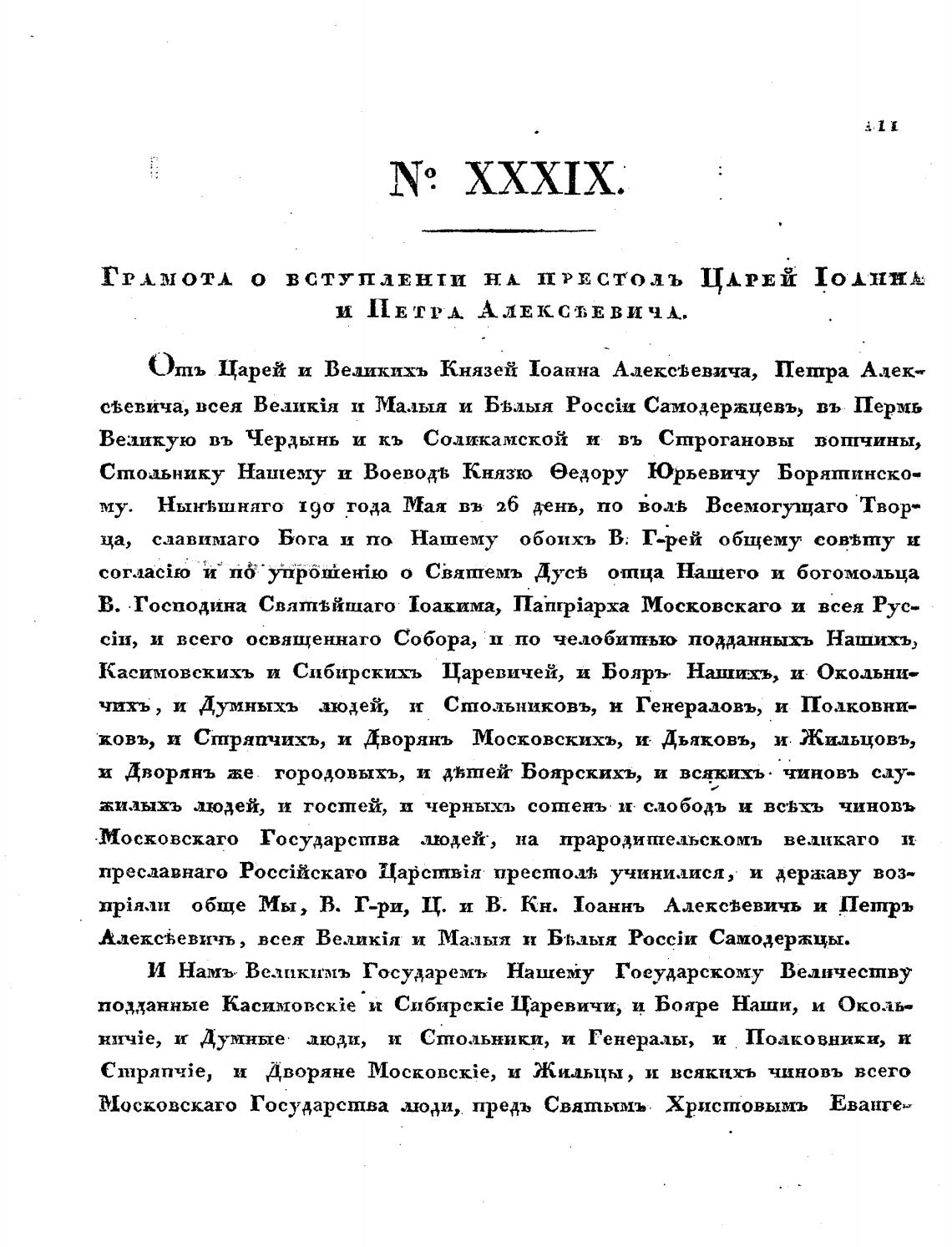 npiH.111 обще Мы, В. Г-ри, Ц. и В. Кн. 1оаннъ Алекс•вевичь и Пешръ