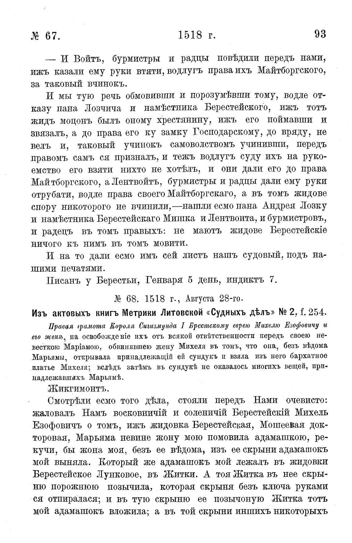 Изъ актовыхъ книгъ Метрики Литовской «Судныхъ д%лъ» N2 2, f. 254.