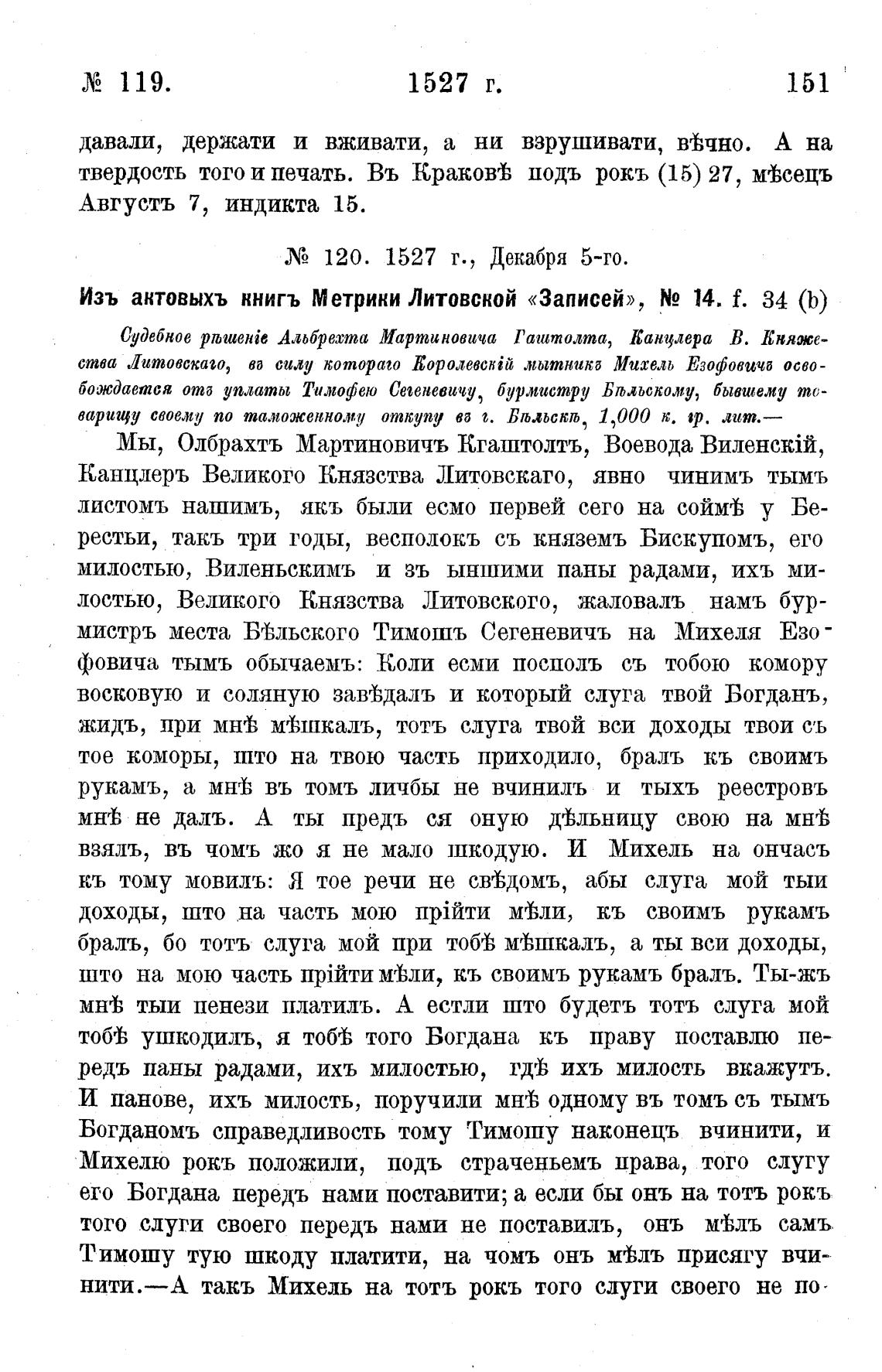 Изъ актовыхъ ннигъ Метрики Литовской «Записей», N2 14. f. 34 (Ь)