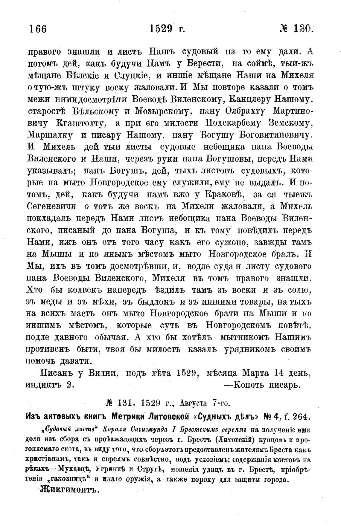 Изъ актовыхъ книгъ Метрики Литовской «Судныхъ д%лъ» Ng 4, f. 264.