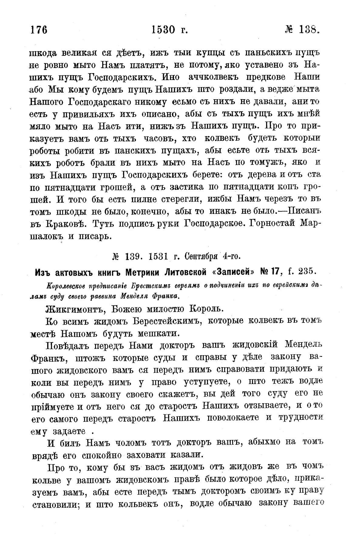 Изъ актовыхъ книгъ Метрики Литовской «Записей» N2 17, f. 235.