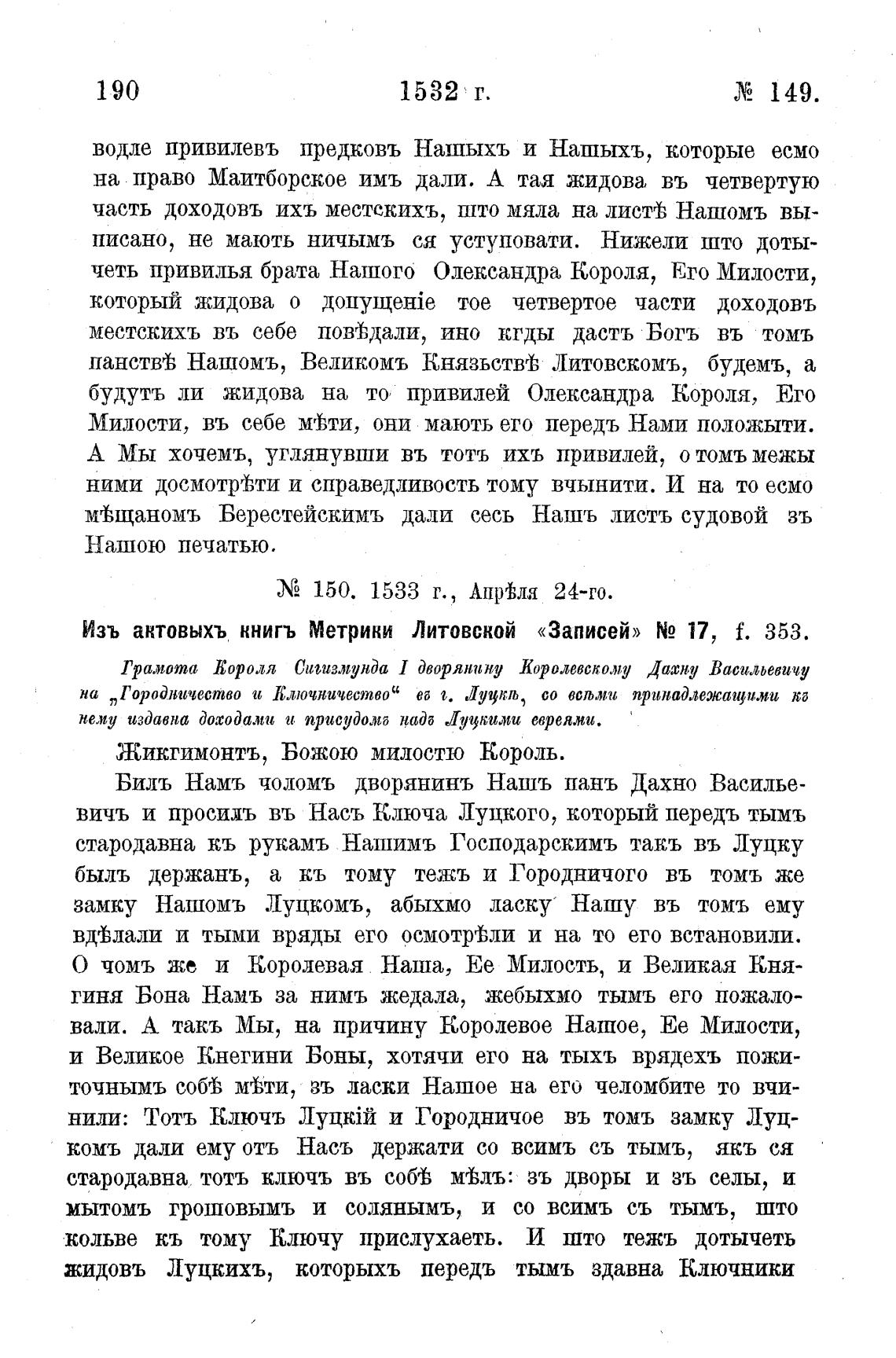 Изъ актовыхъ ннигъ Метрики Литовской «Записей» N2 17, f. 353.