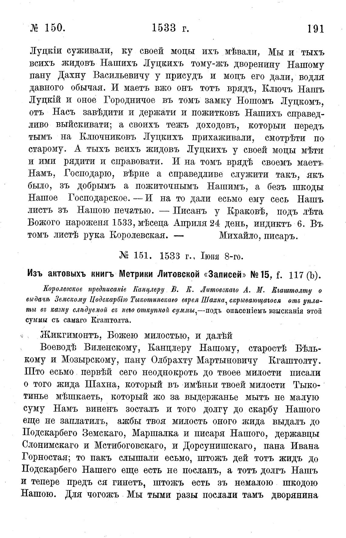Изъ актовыхъ книгъ Метрики Литовской «Записей» N2 15, f. 117 (Ь).