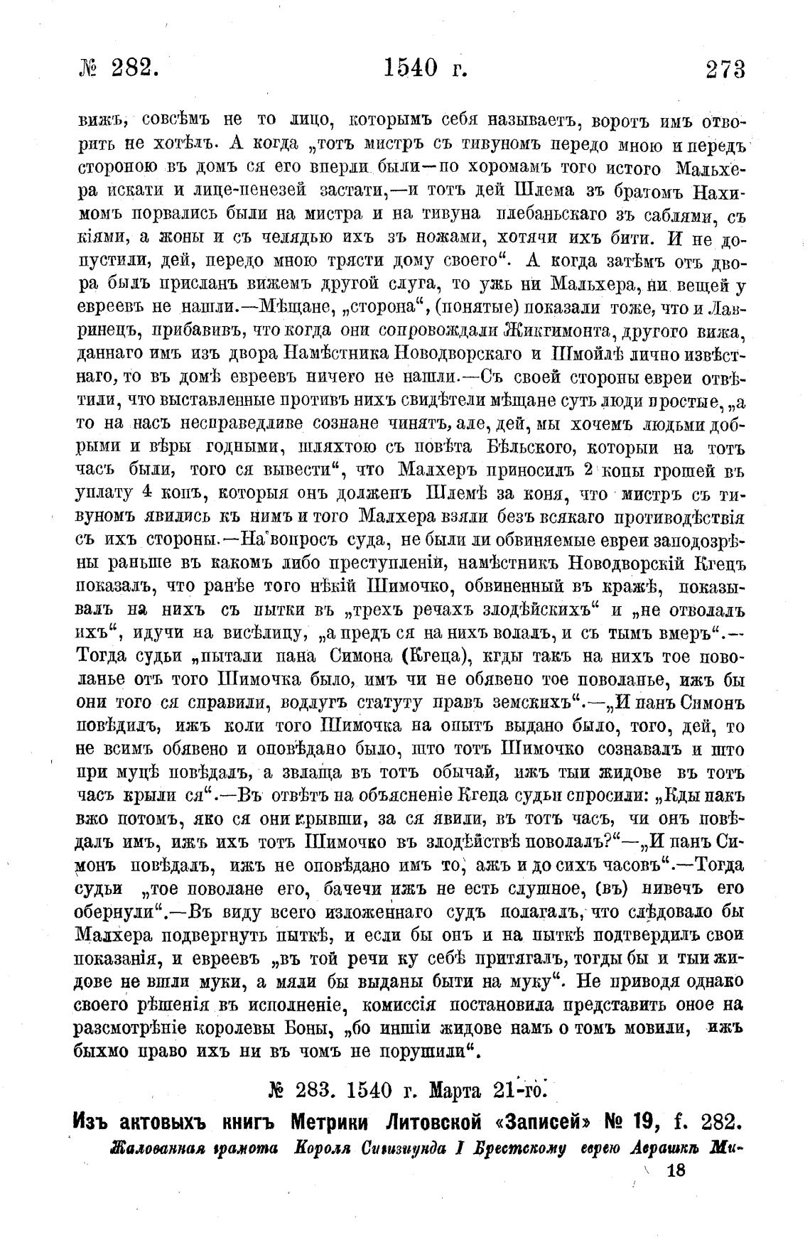 Изъ актовыхъ Метрики Литовской «Записей» N2 19, f. 282.