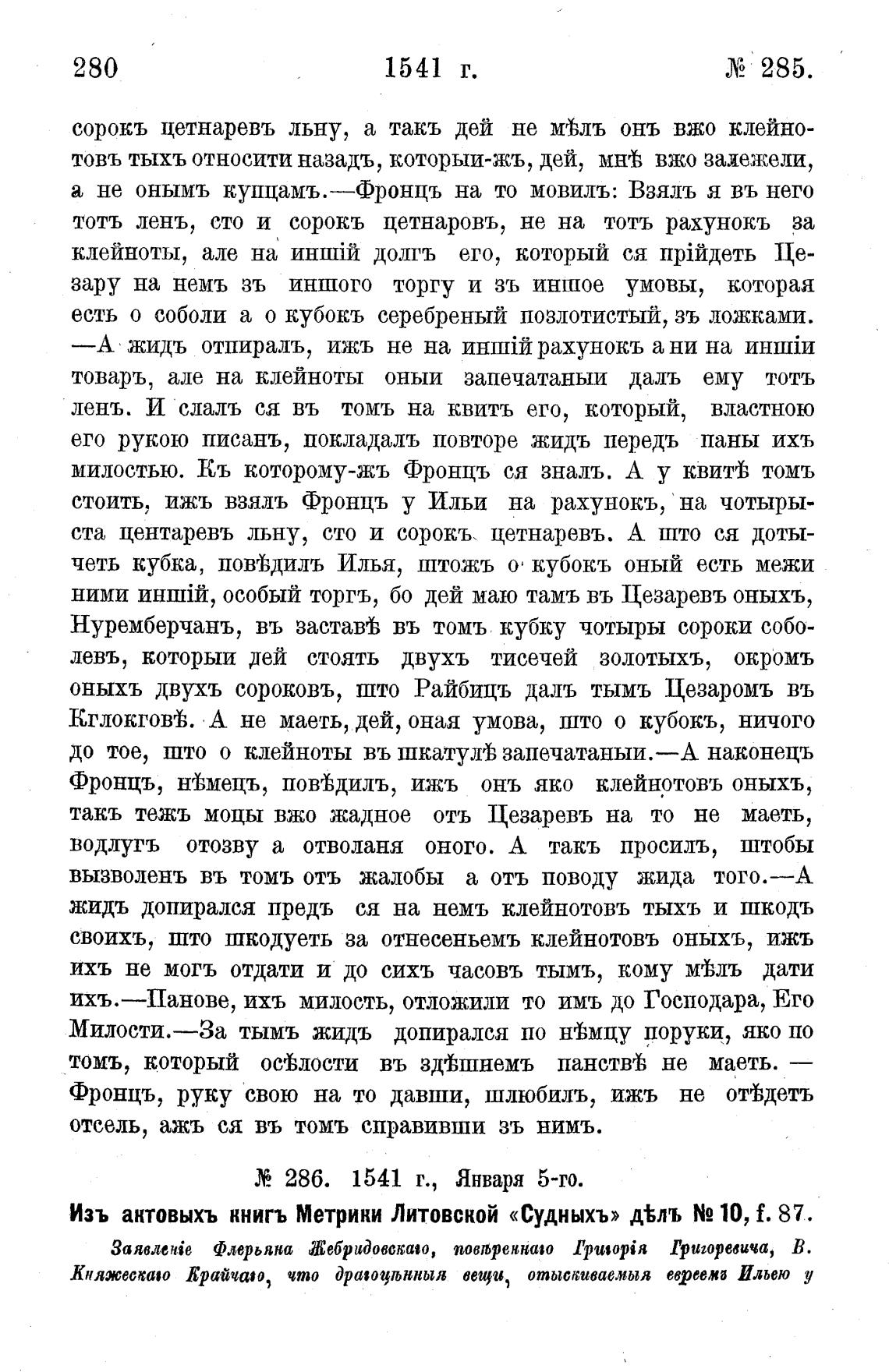 Изъ антовыхъ книгъ Метрики Литовской «Судныхъ» д%лъ N2 10, f. 87.