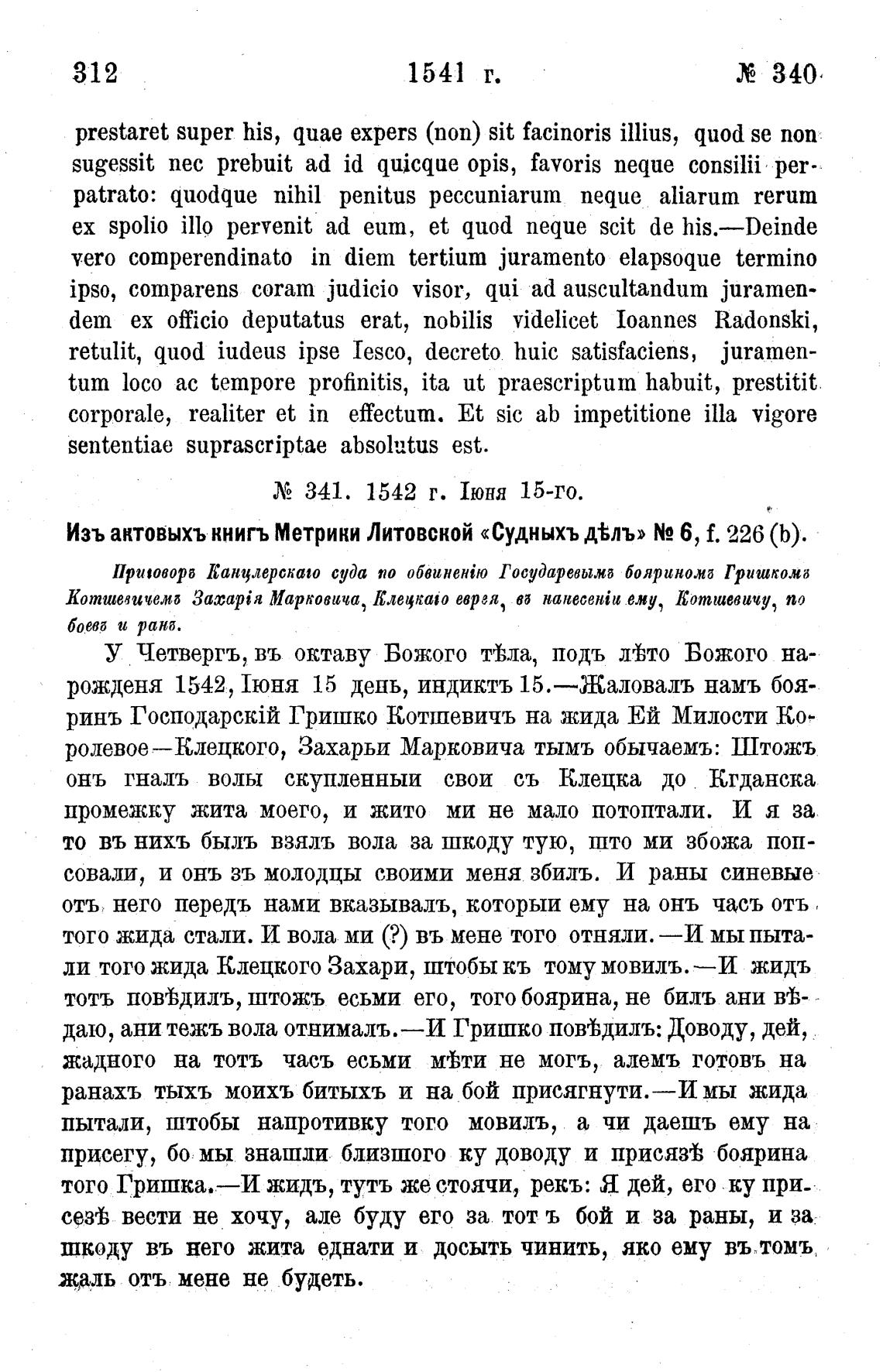 Изъ актовыхъ книгъ Метрики Литовской «Судныхъ д%лъ» N2 6, f. 226 (Ь).