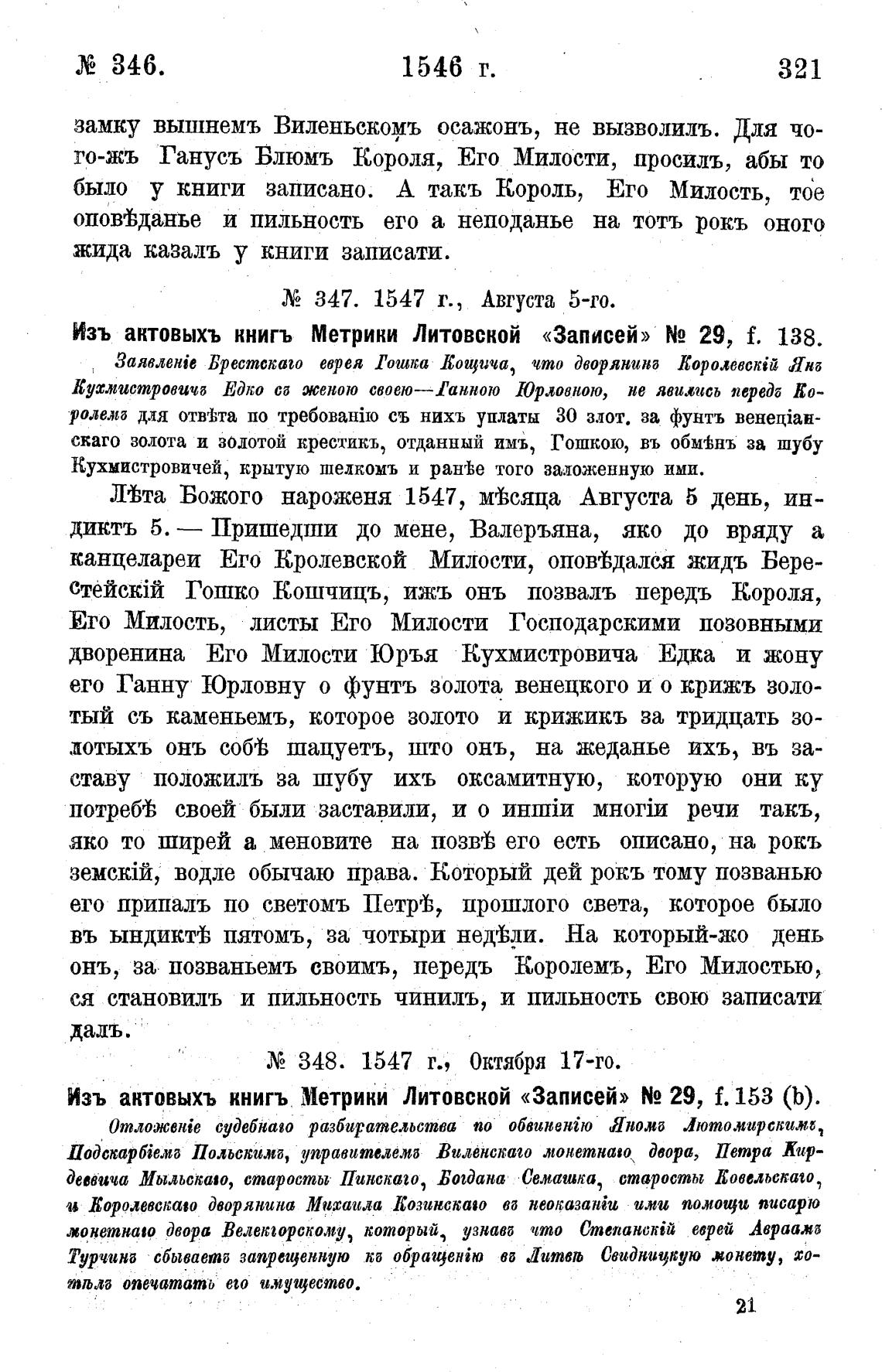 Изъ актовыхъ книгъ Метрики Литовской «Записей» N2 29, f. 138.