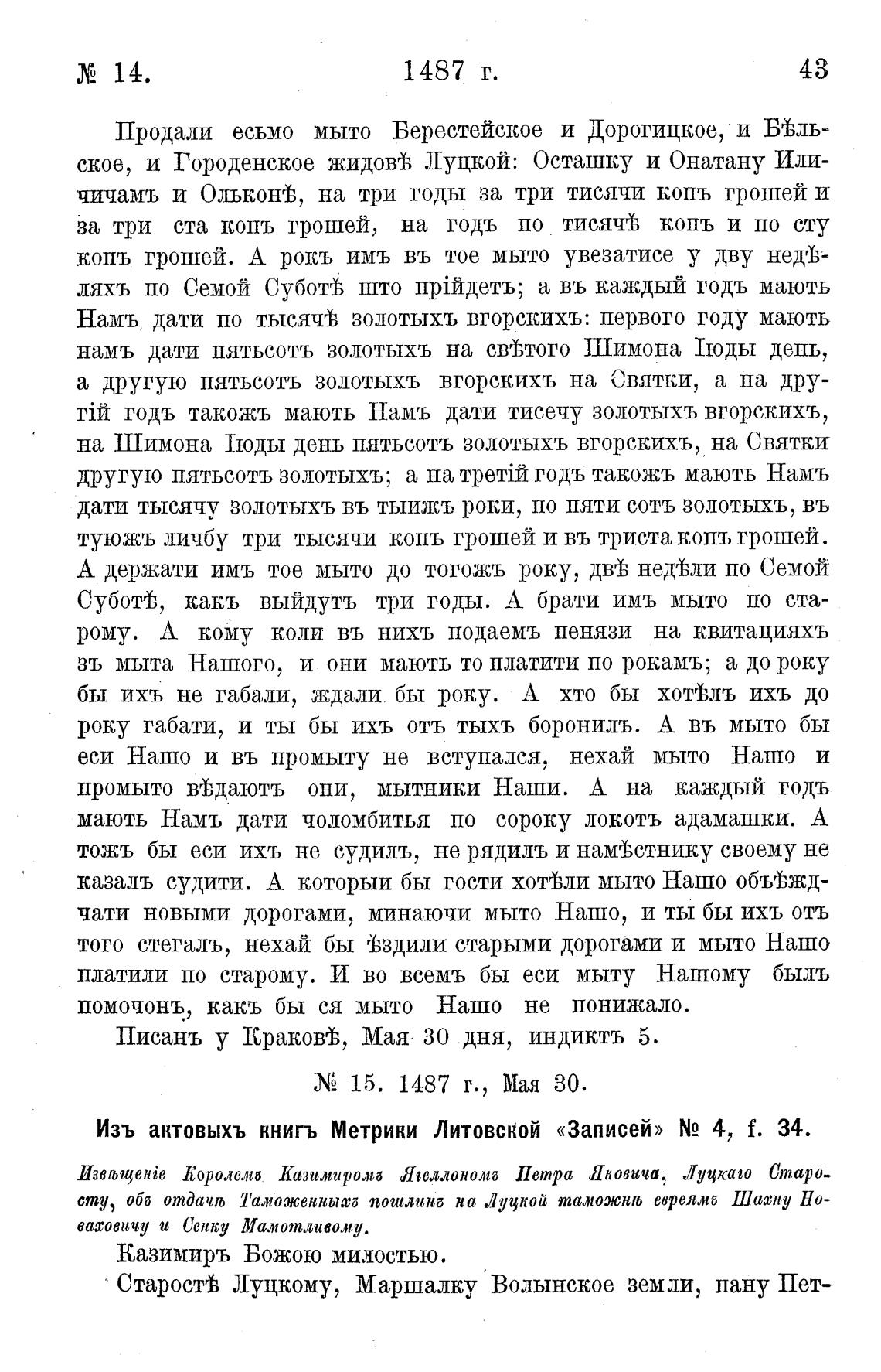 Изъ актовыхъ книгъ Метрики Литовской «Записей» N2 4, f. 34.