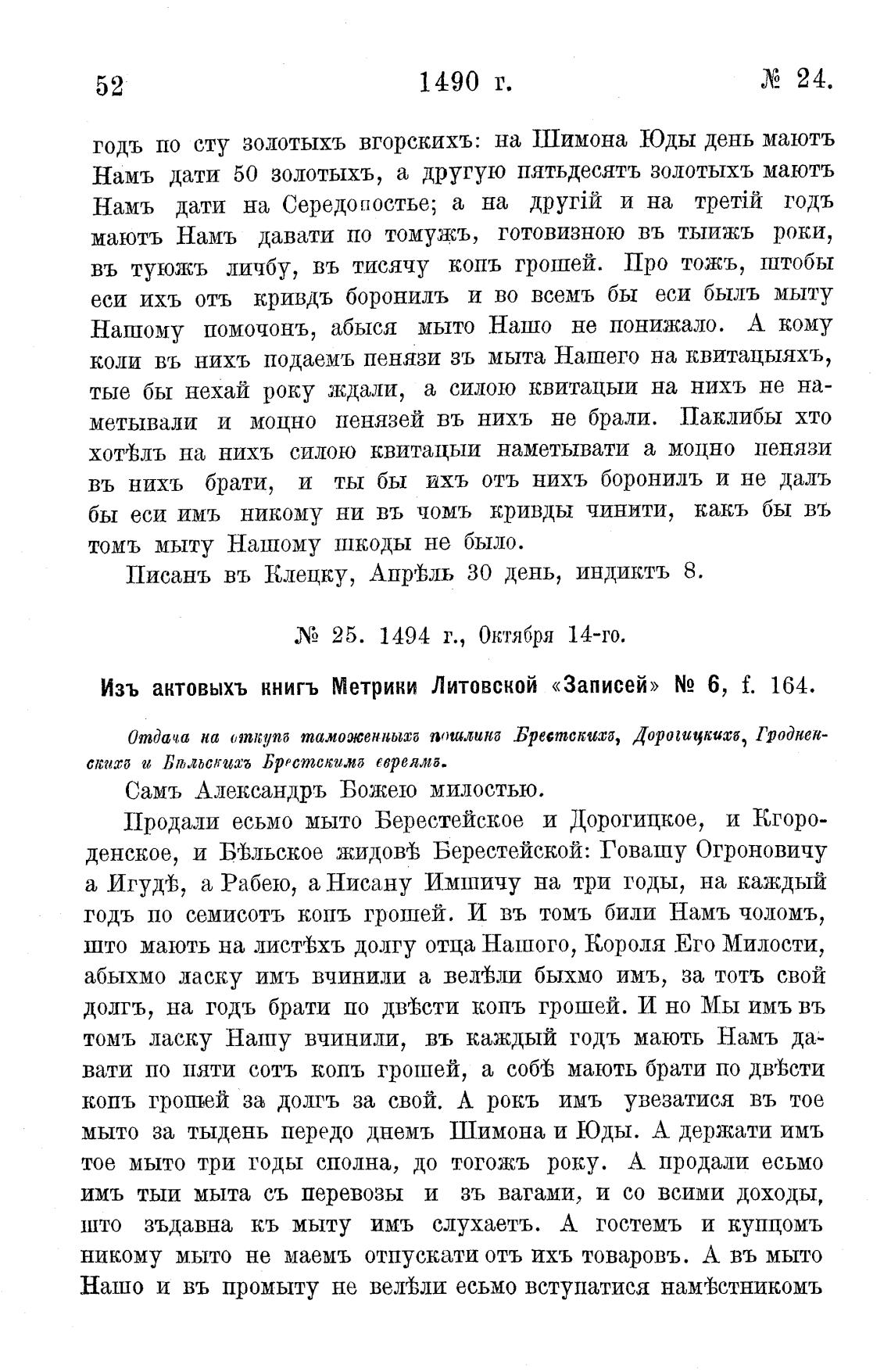 Изъ актовыхъ книгъ Метрики Литовской «Записей» N2 6, f. 164.