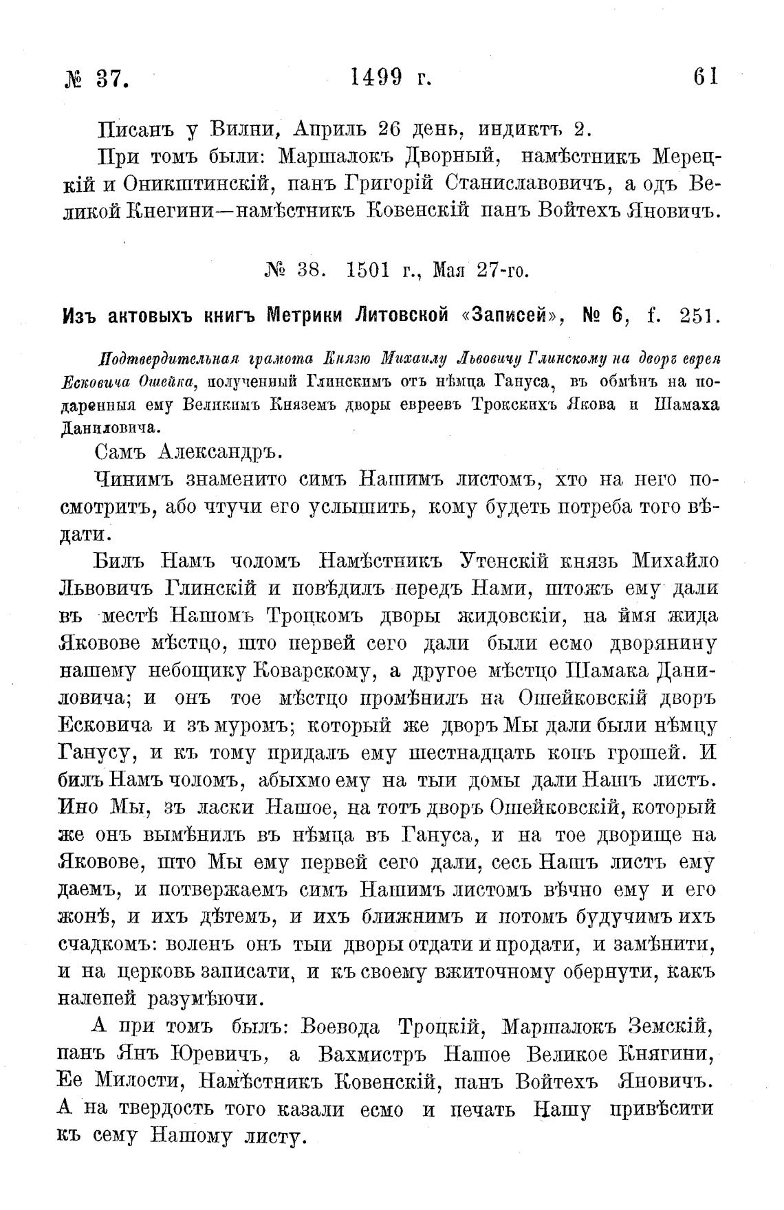 Изъ актовыхъ книгъ Метрики Литовской «Записей»,