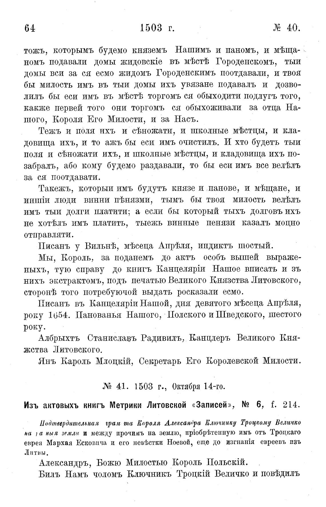 Изъ актовыхъ книгъ Метрики Литовской «Записей»,