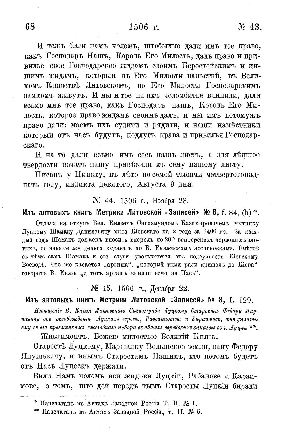 Изъ актовыхъ книгъ Метрики Литовской «Записей» N2 8, f. 129.