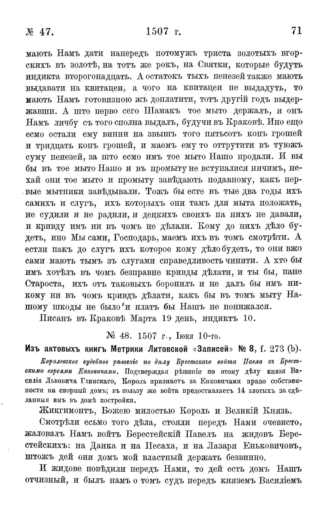 Изъ актовыхъ книгъ Метрики Литовской «Записей» N2 8, f. 273 (Ь).