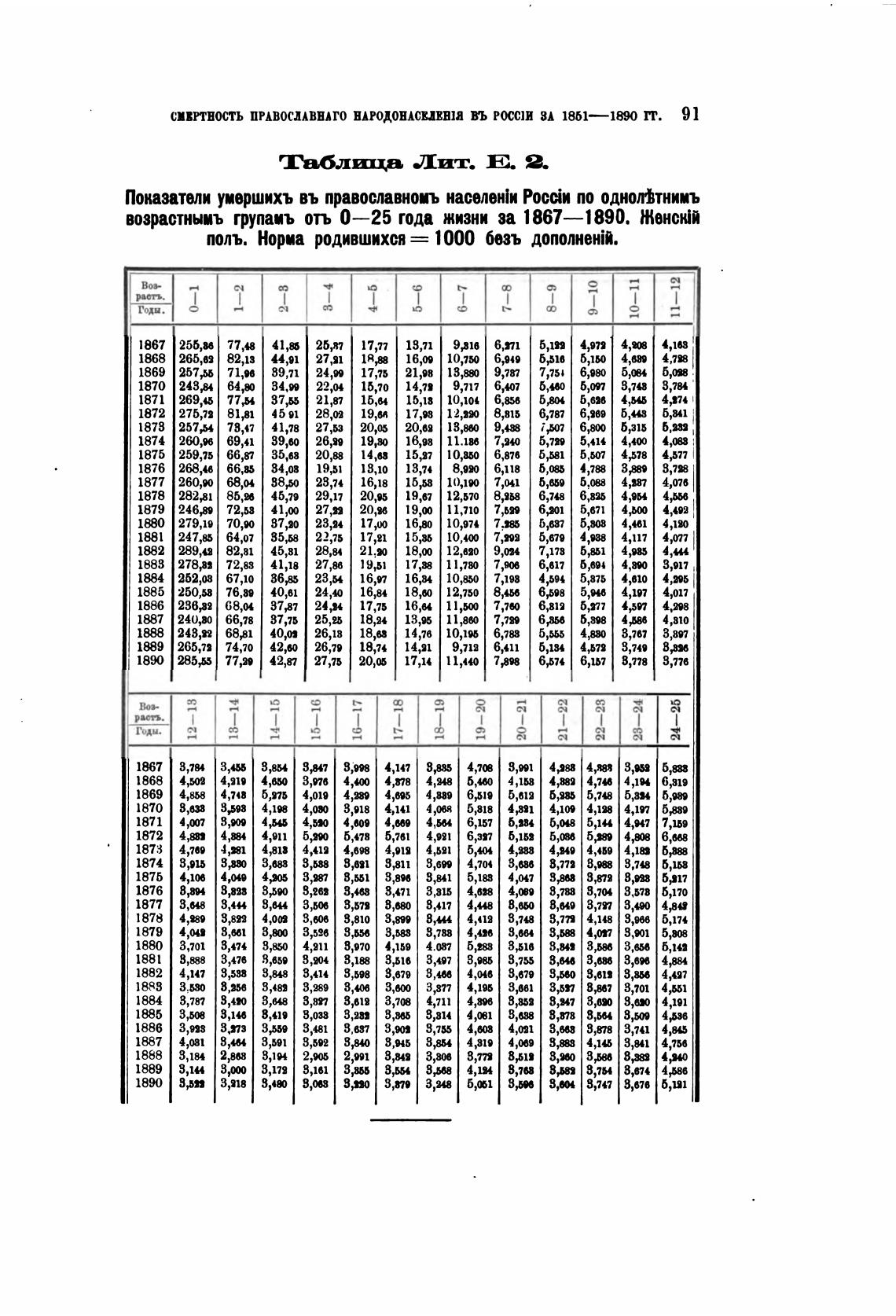 возрастныиъ групаиъ отъ 0—25 года жизни за 1867—1890. Женск)й