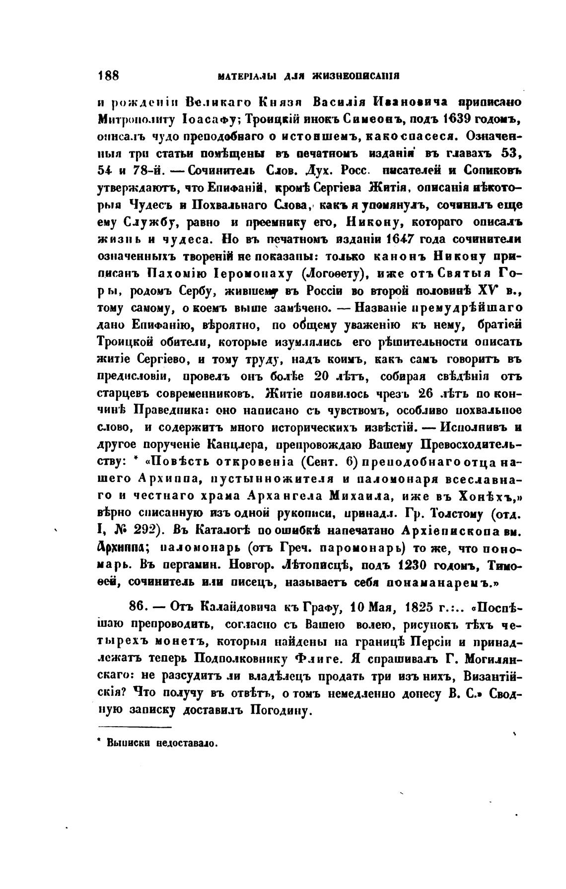 86. — Отъ Калайдовича кь Графу, 10 Мая, 1825 г.:.. «Поспев-