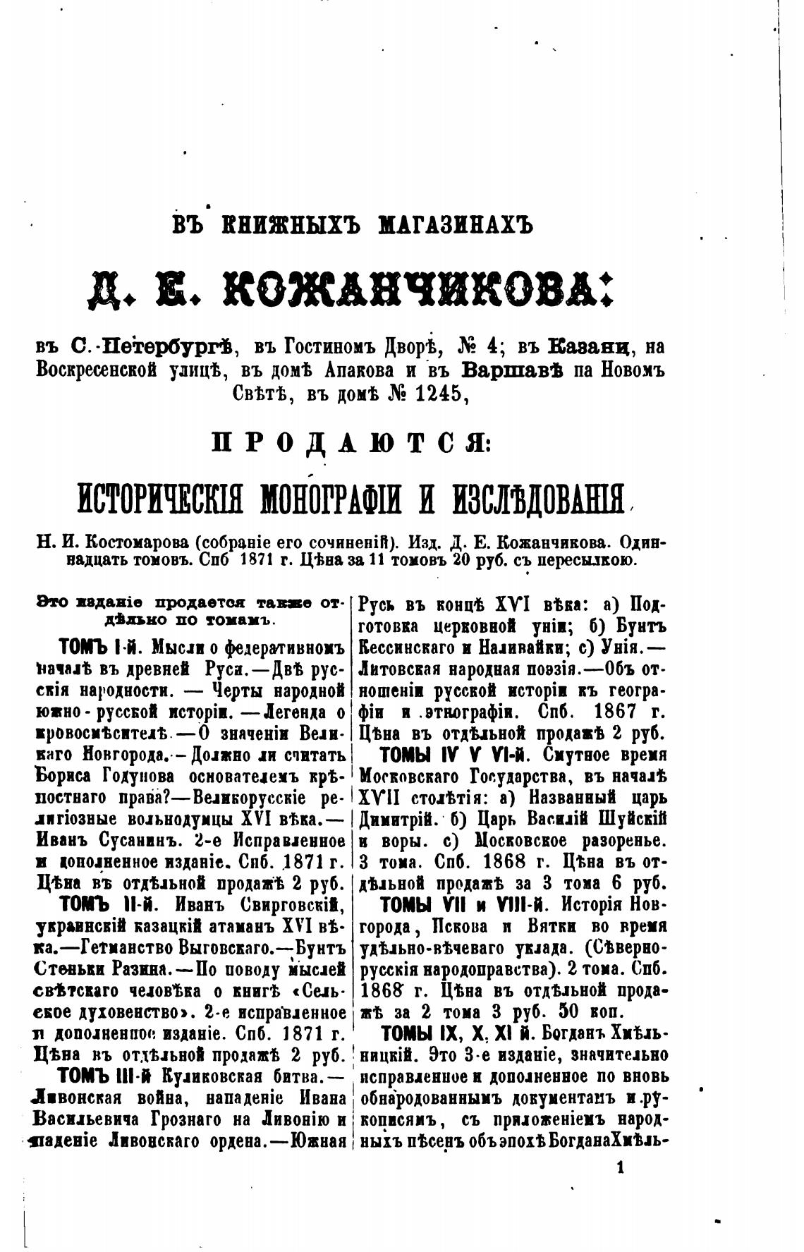Н. И. Костомарова (c06pBBie его сочиненТ). Изд. Д. Е. Кожанчикова. Один-