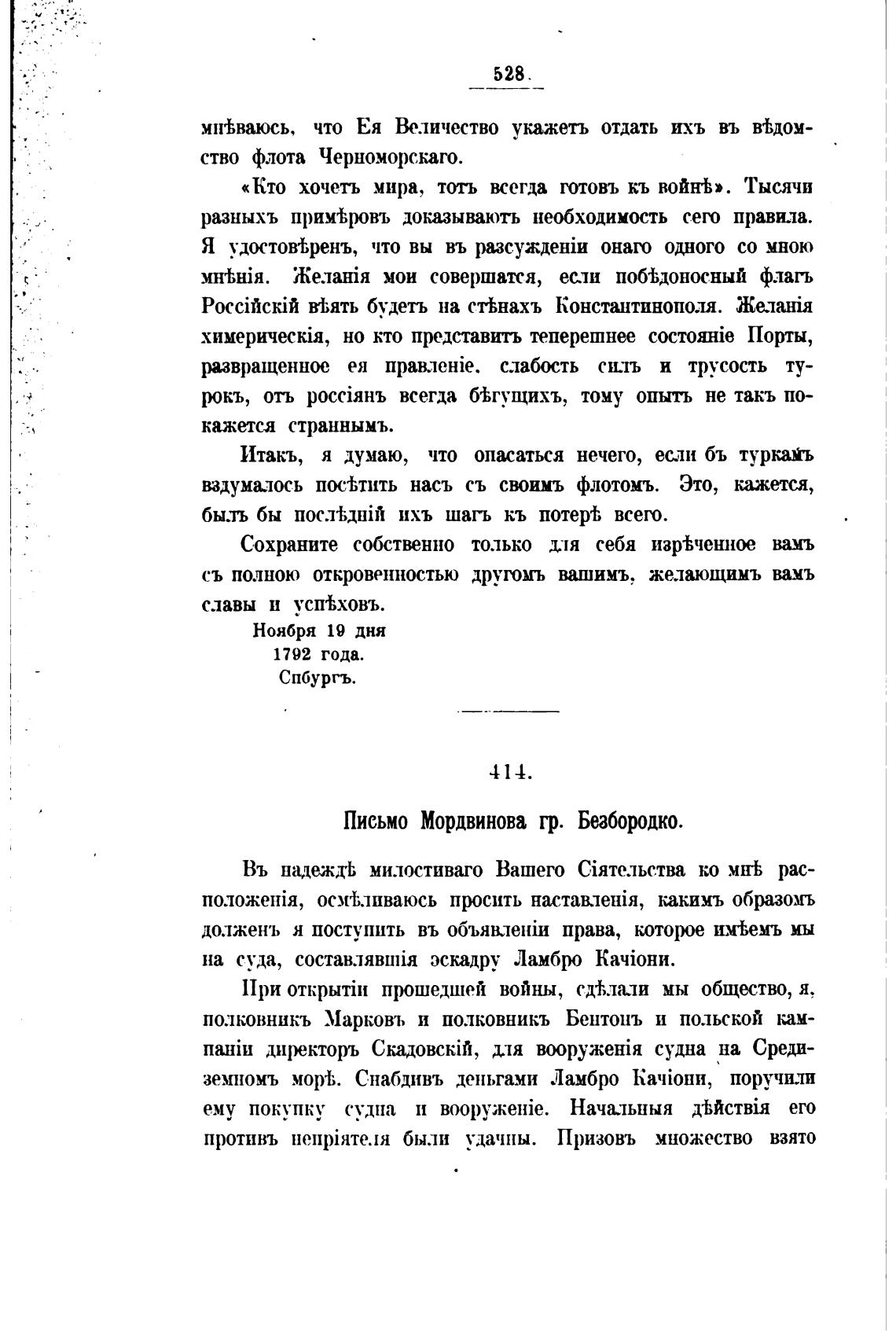 Письмо Мордвинова гр. Безбородко.