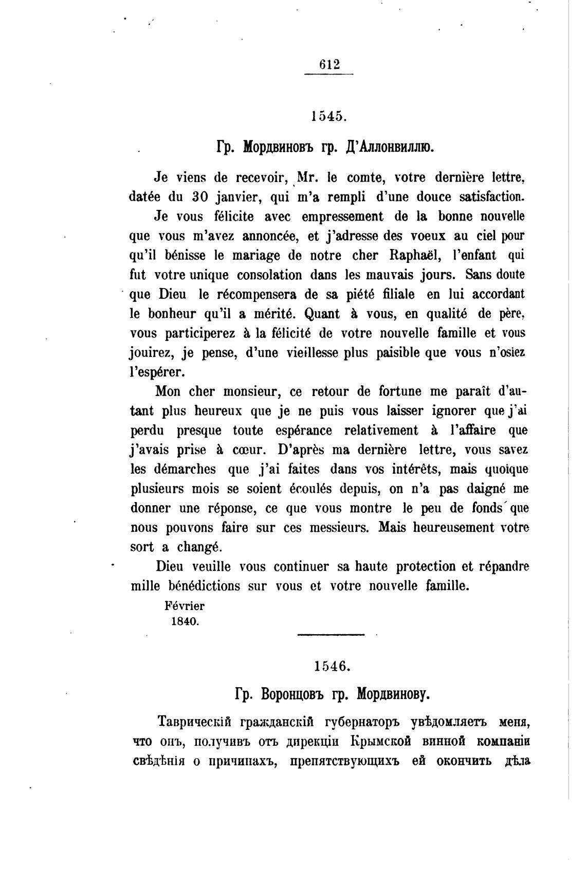 Гр. Воронцовъ гр. Мордвинову.