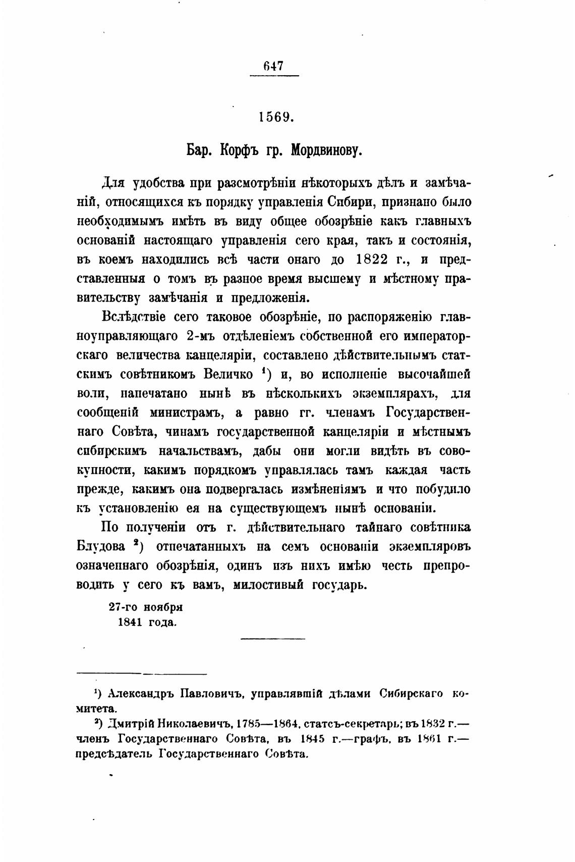 Бар. Корфъ гр. Мордвинову.