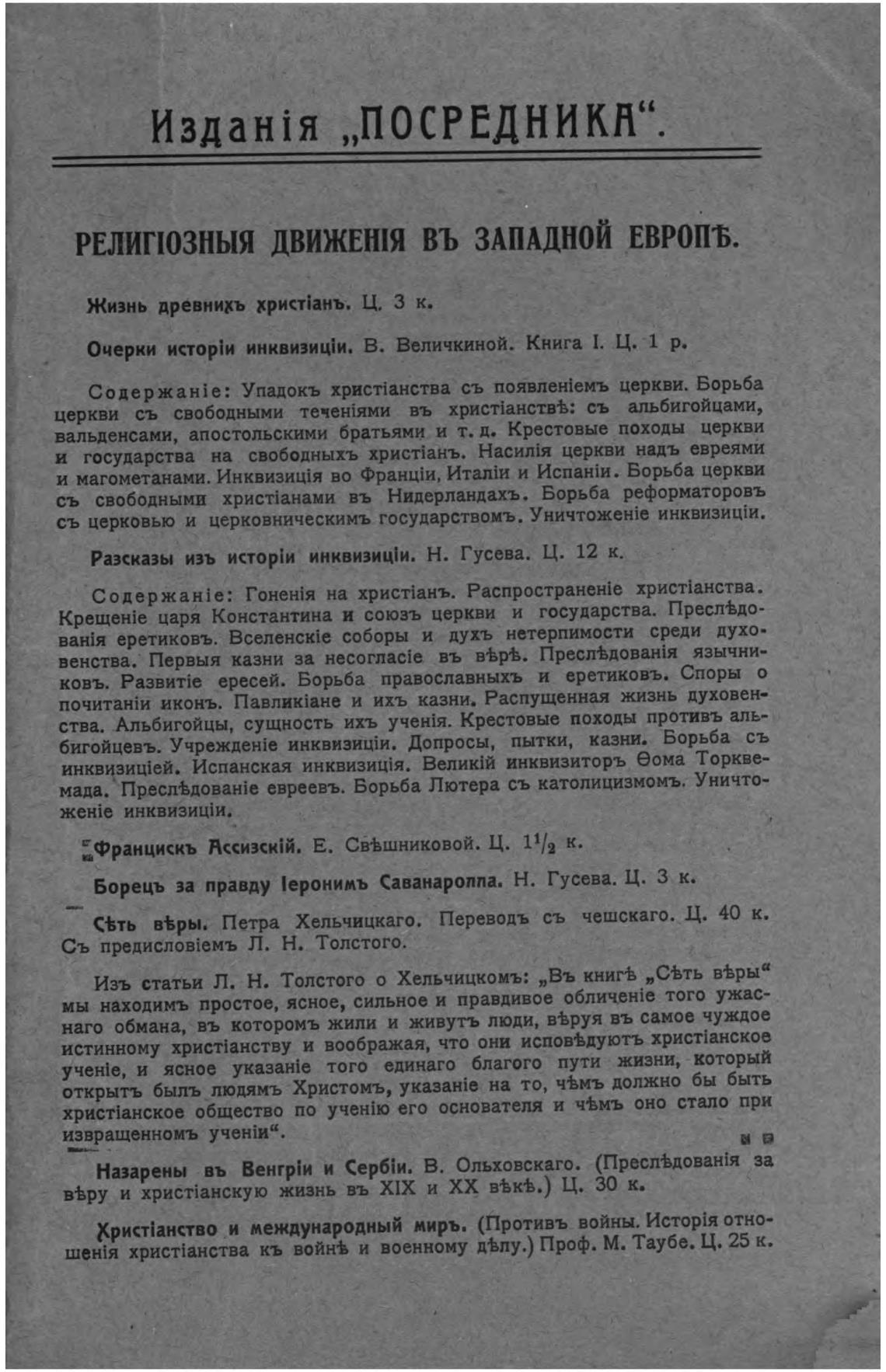 Изъ статьи Л Њ Толстого о Хельчицкомъ: „Въ книгь „СЕТЬ в%рыа