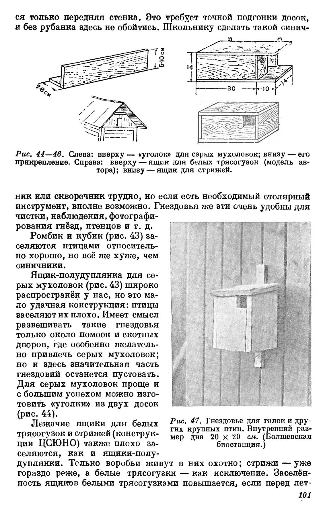 Рис. 44—46. Слева: вверху — «уголок» для серых мухоловок; внизу — его
