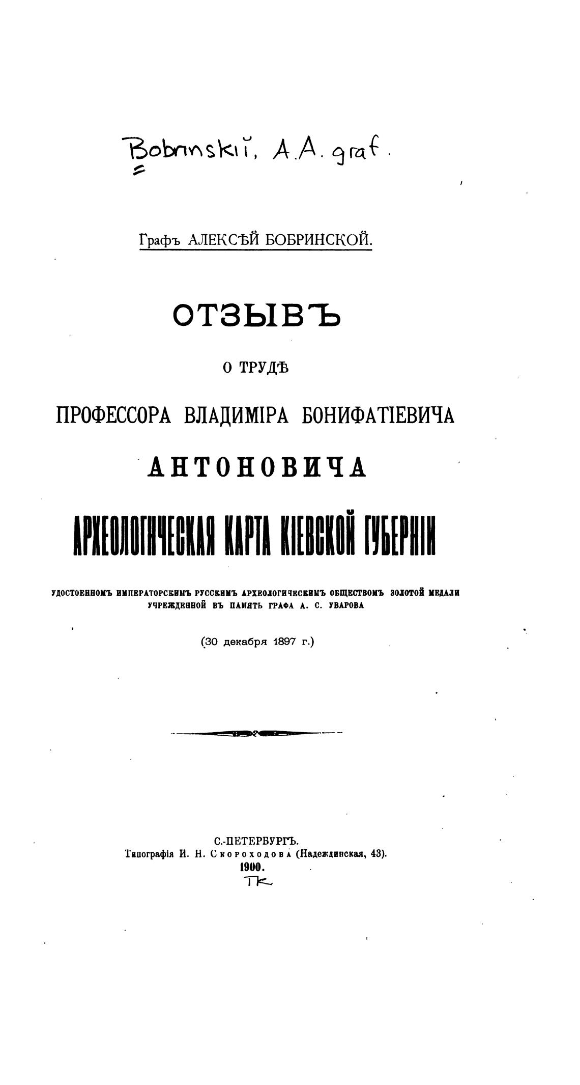 учрвждвнвой ВЪ пкиать ГРАФА А. С. УВАРОВА