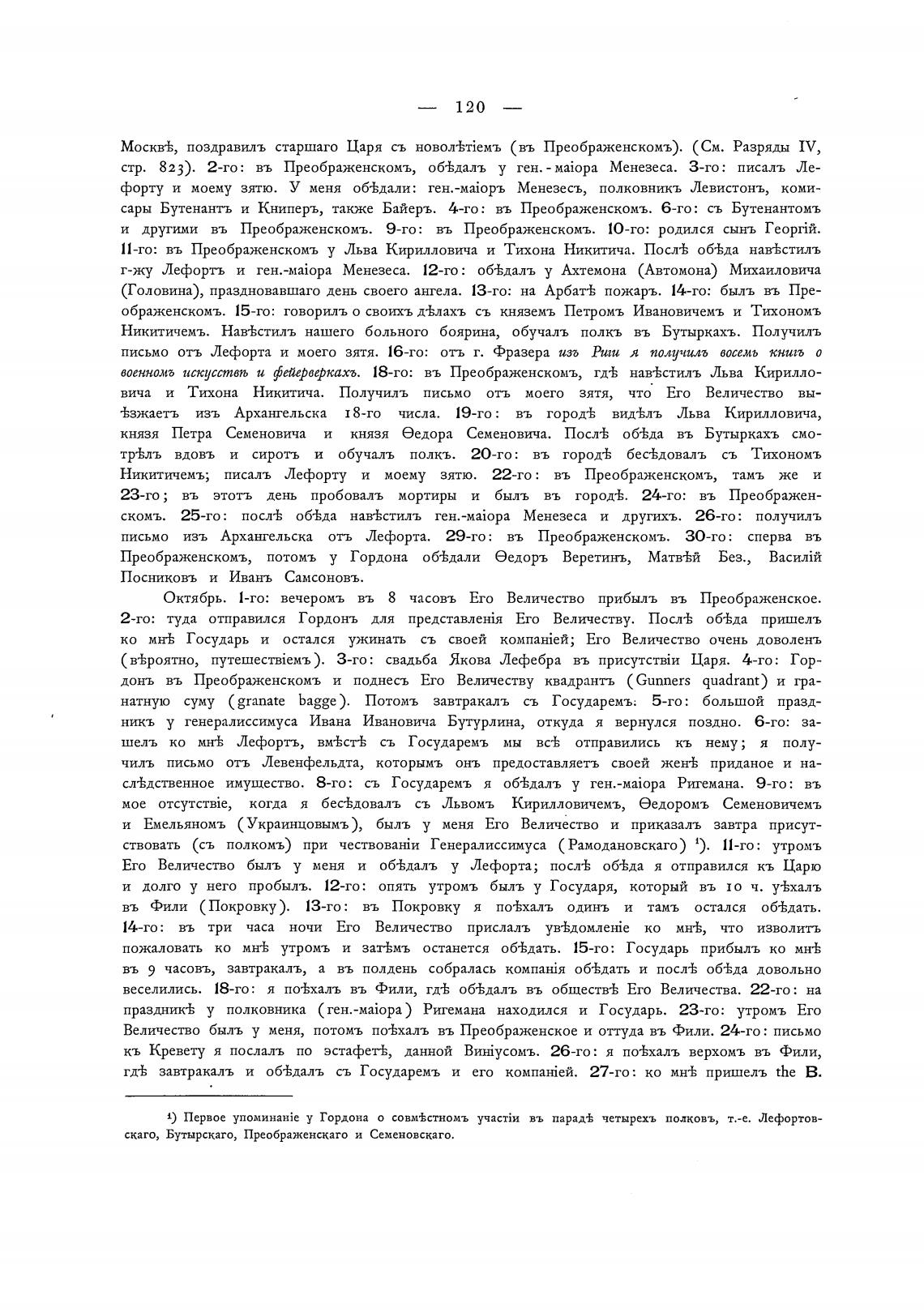 1) Первое упоминанђе у Гордона о совм±стномъ въ парад± четырехъ полковъ, т.-е. Лефортов-