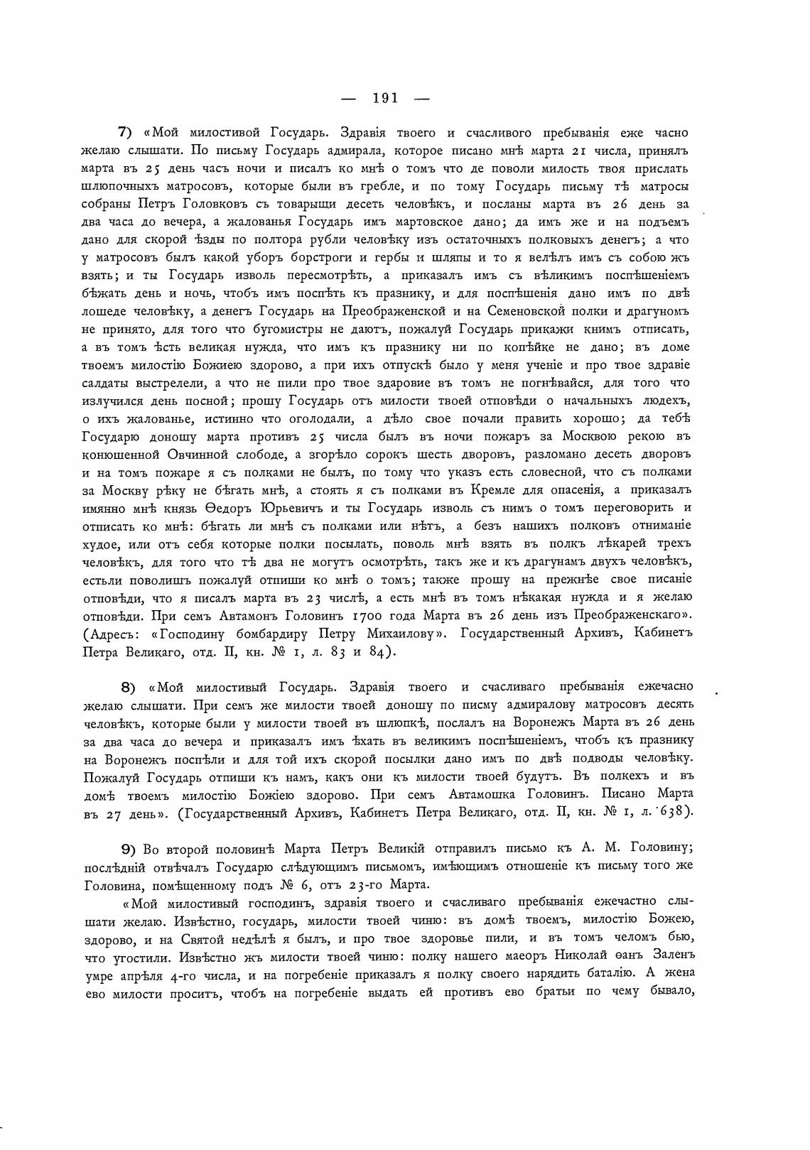 9) Во второй половинЊ Марта Петръ отправилъ письмо кь А. М. Головину;