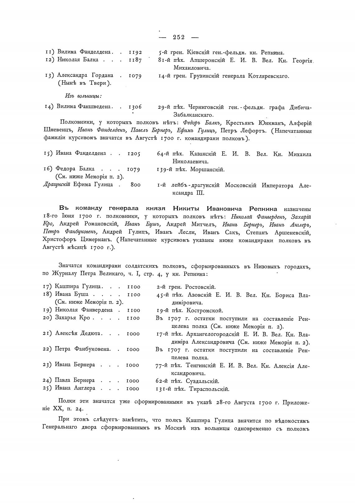 курсивомъ значатся въ Август± 1700 г. командирами полковъ).