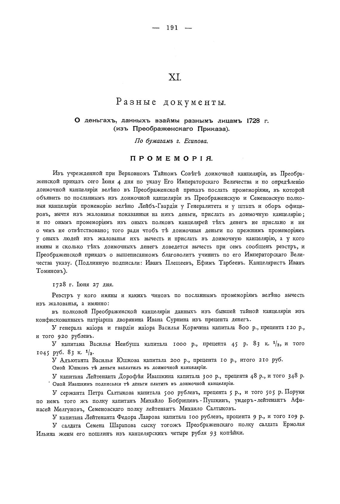 О деньгахъ, данныхъ взаймы разнымъ лицамъ 1728 г.