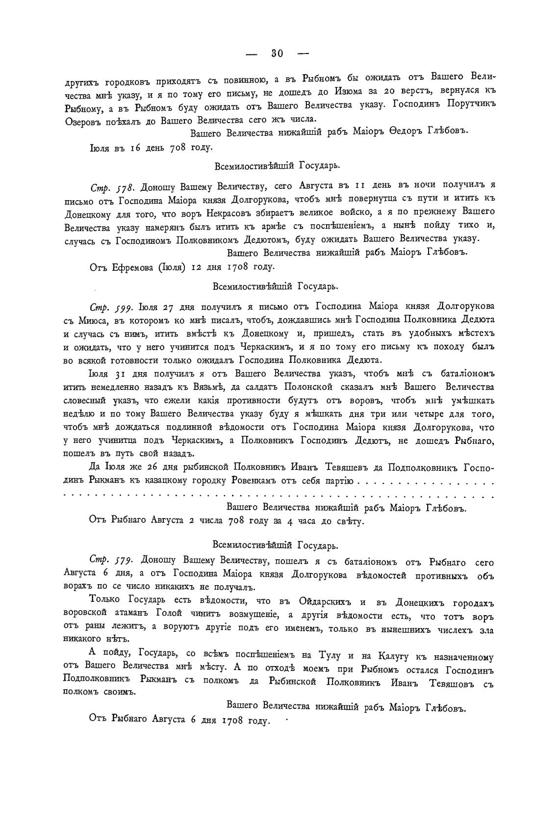 Стр. 579. Доношу Вашему Величеству, пошелъ я съ 6arav'Ii0H0Mb отъ Рыбнаго сего