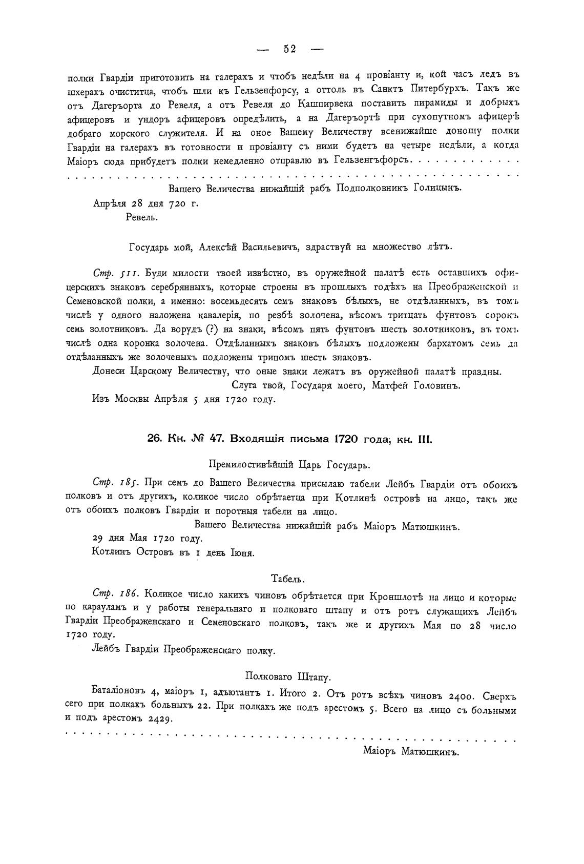 Стр. 185. При семь до Ваппего Величества присылаю табели Лейбъ отт, обоихъ