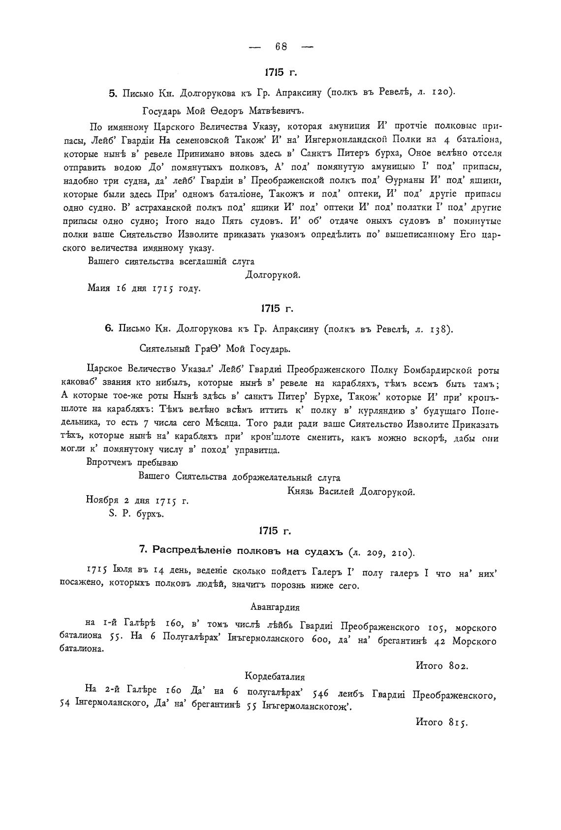 б. Письмо Кн. Долгорукова кь Гр. Апраксину (полкъ въ Ревел±, л. 8).