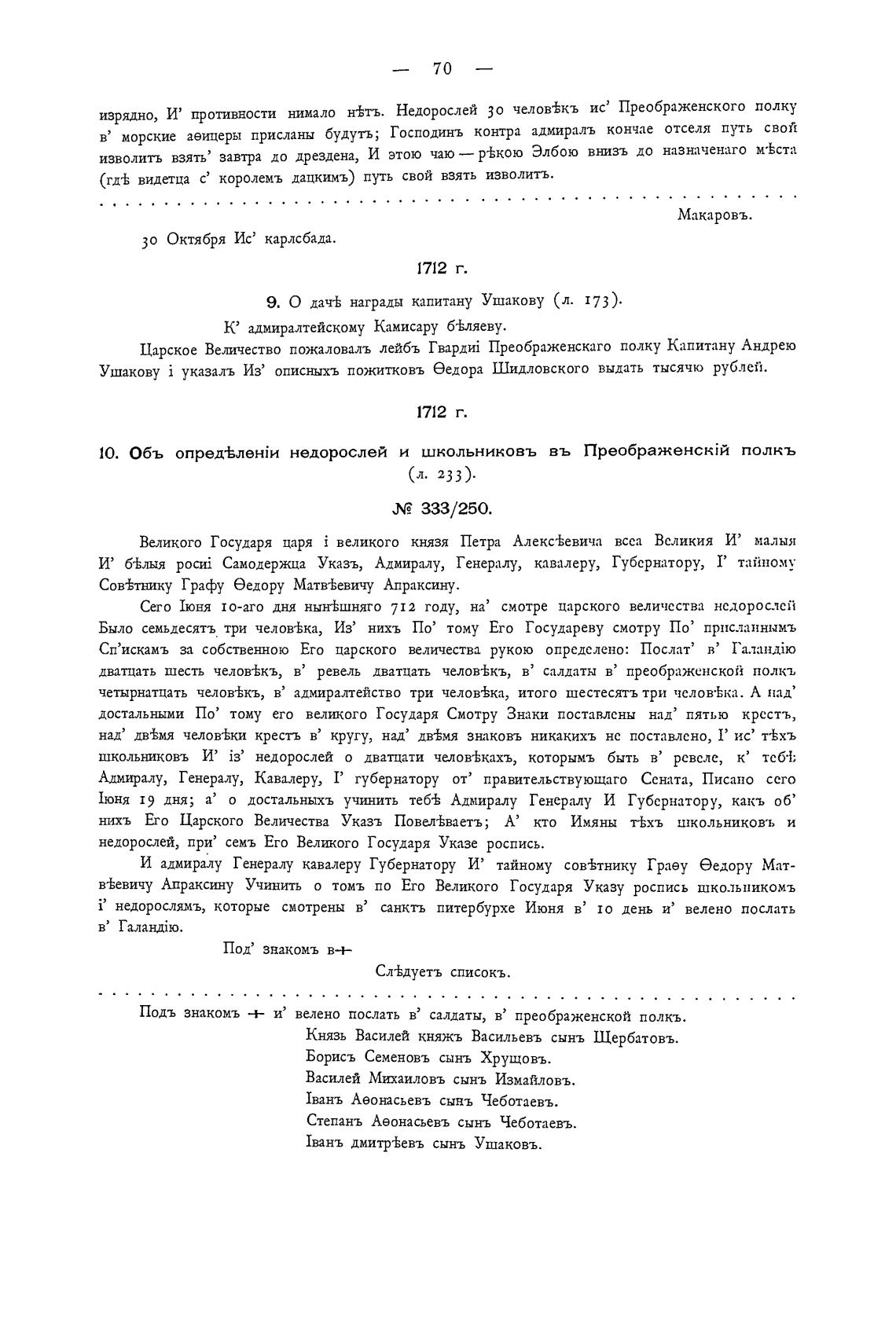 9. О дач-Ь награды капитану Ушакову (л. 173).