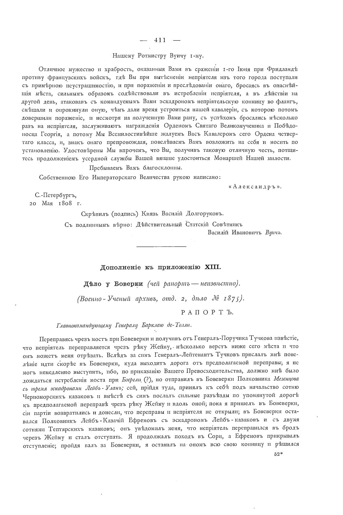 Переправясь чрезъ мостъ при Бовеверки и получивъ отъ Генералъ-Поручнка Тучкова 113B±cTie,