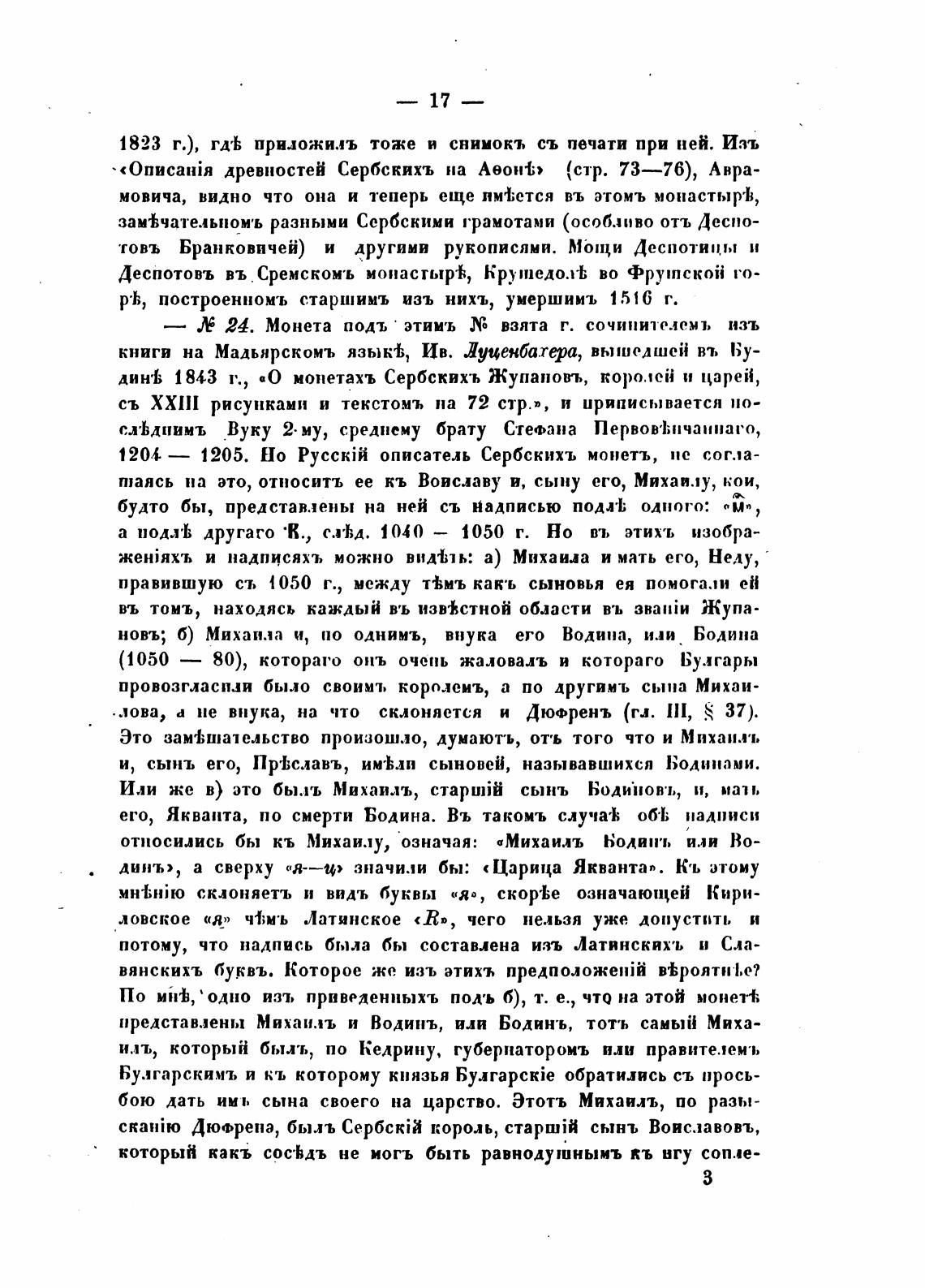 дин•1; 1843 г., монетахъ Сербских•ь Жупаповт„ королей и царе“,