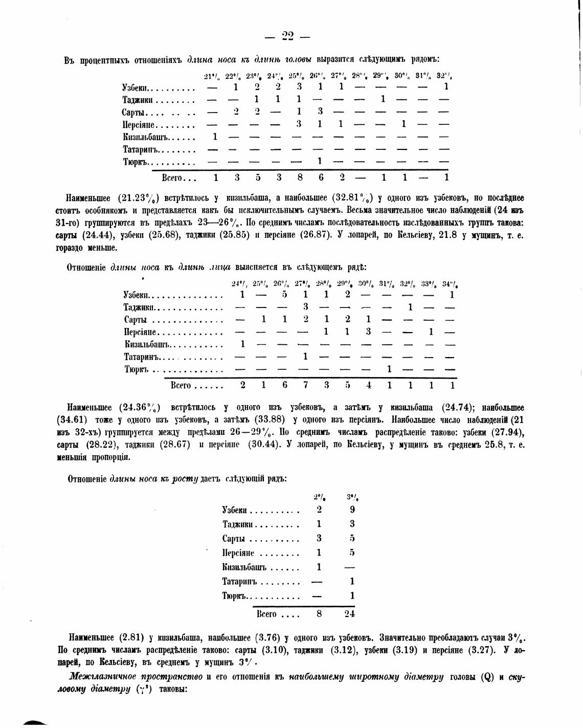 Наименьшее (2.81) у низшьбаша, наибольшее (3.76) у одного изъ узбековъ. Значительно мучаи 30/0.