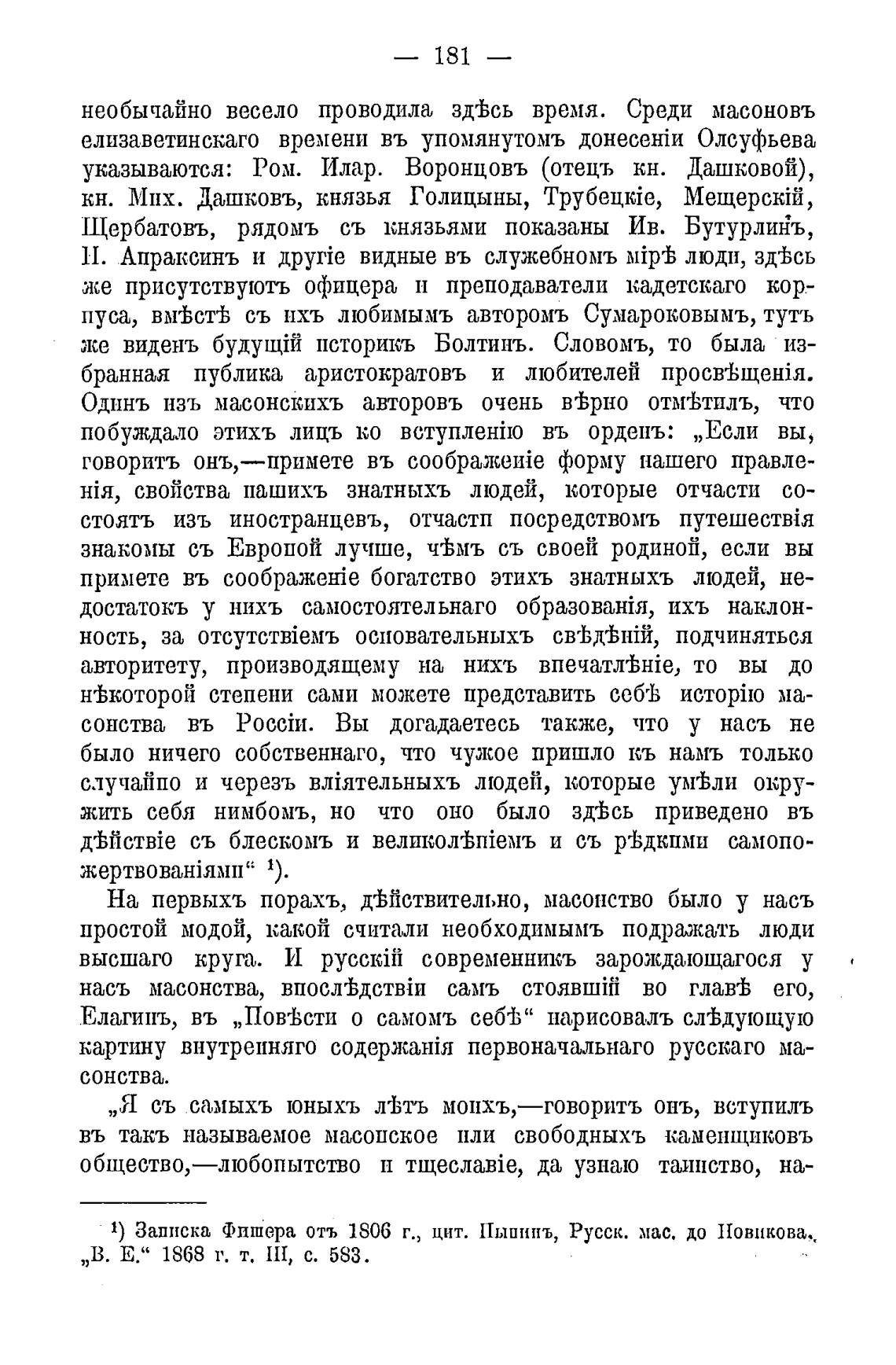 1) Записка Фпшера отъ 1806 г., цит. Пыиинъ, Русск. мас. до 11овикова.,