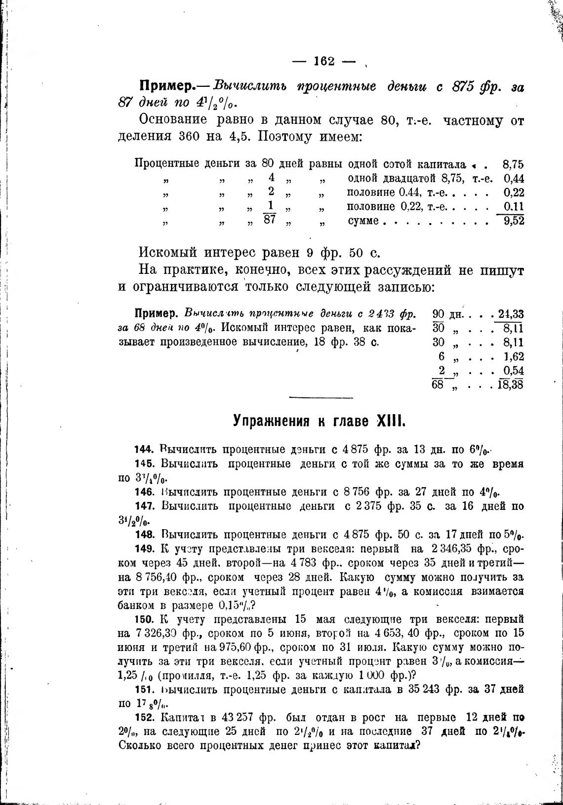 148. Вычислить процентные деньги с 4875 фр. 50 с. за 17 дней по 50/0.