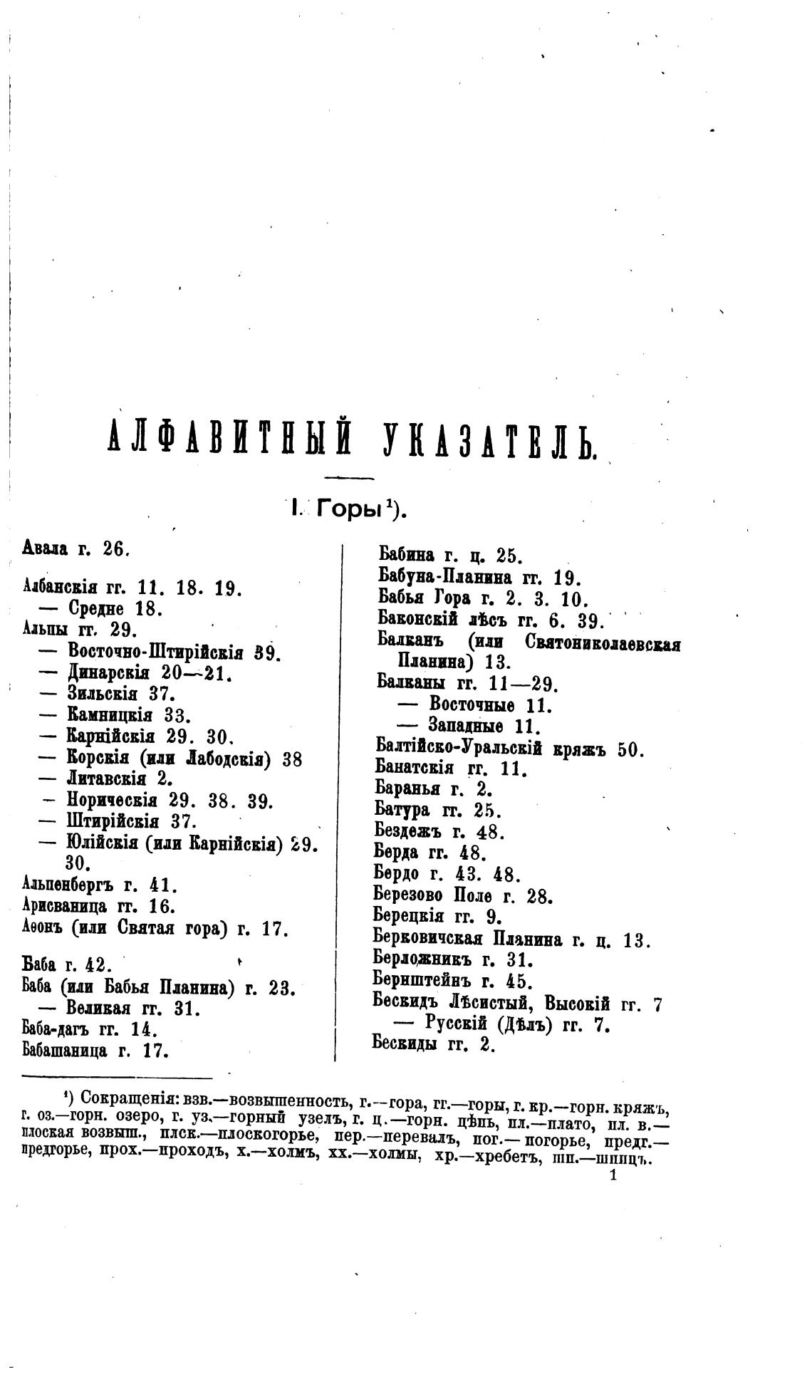 1) взв.—возвшпенность, г.—гора, гг.—горы, г. пр.—горн. кряжъ,