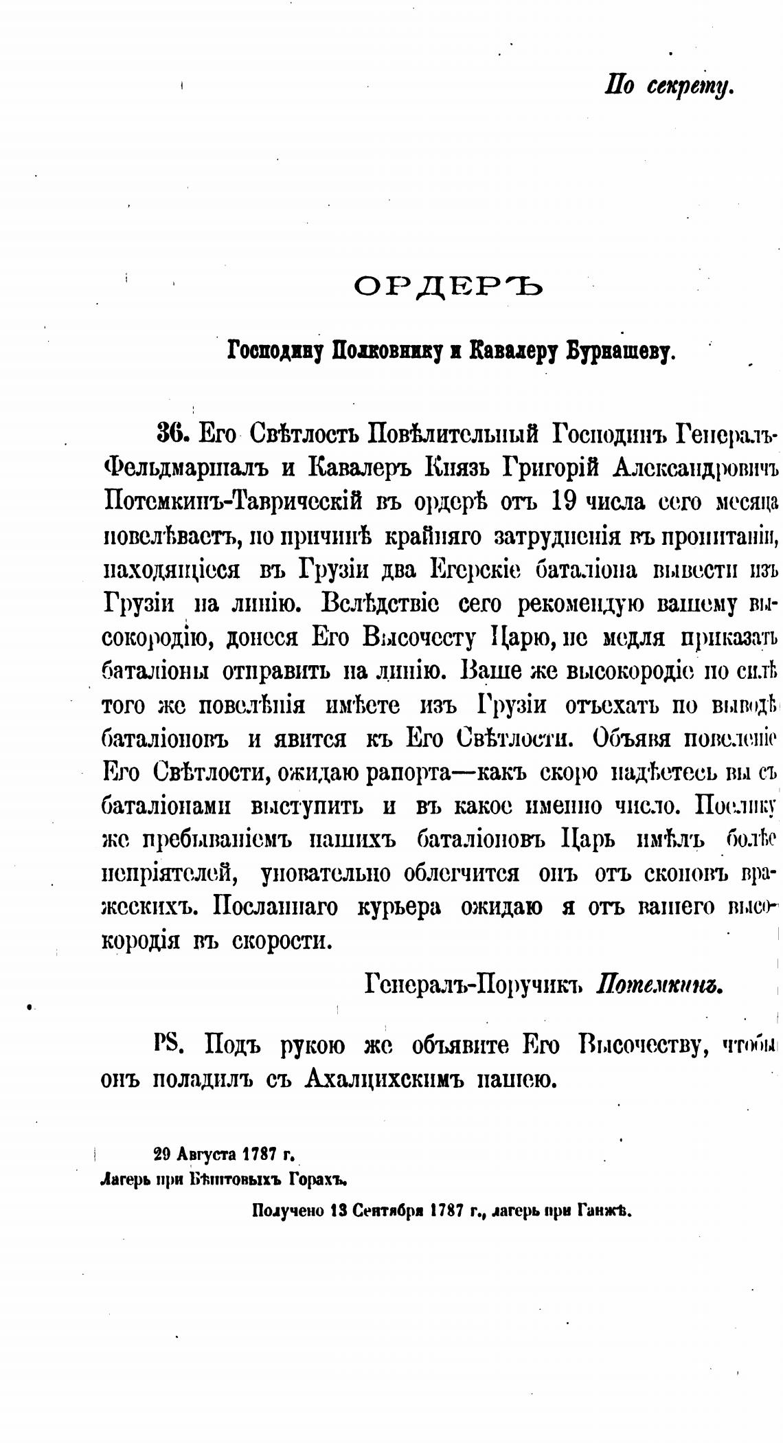 Подучено 13 Сентябри 1787 г., лагерь при Ганж$.