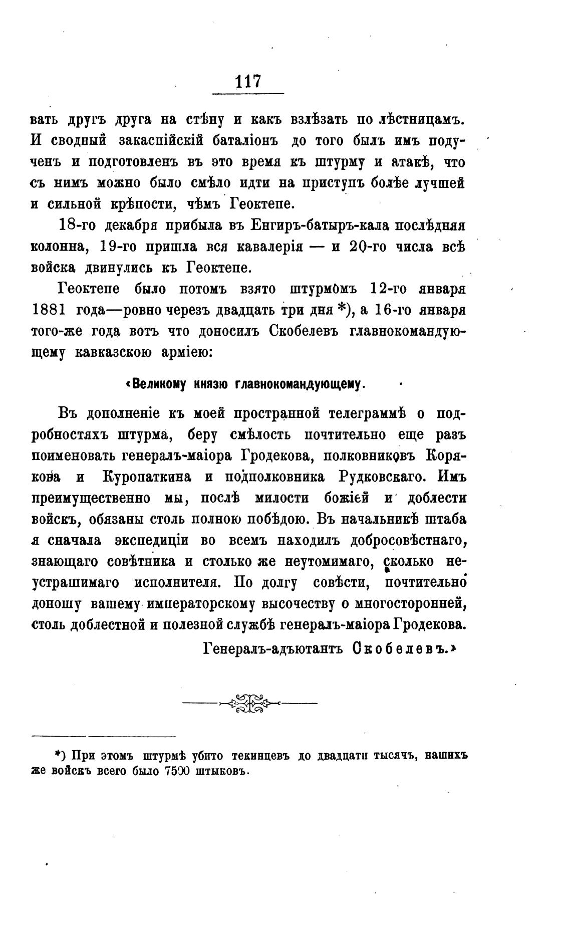 *) При этомъ штурм± убито текинцевъ до двадцати тысячъ, вашихъ