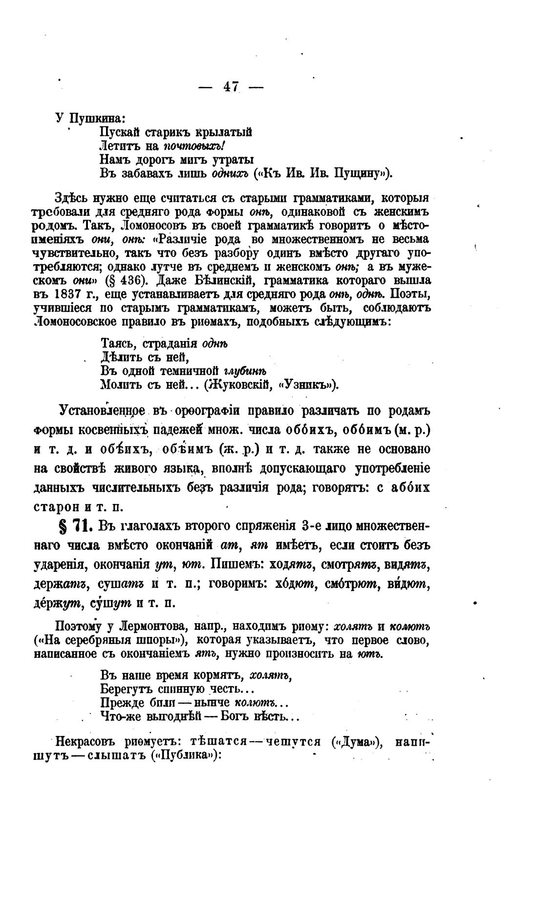 Поэтому у Лермонтова, напр., находимъ риому: холятъ и колют