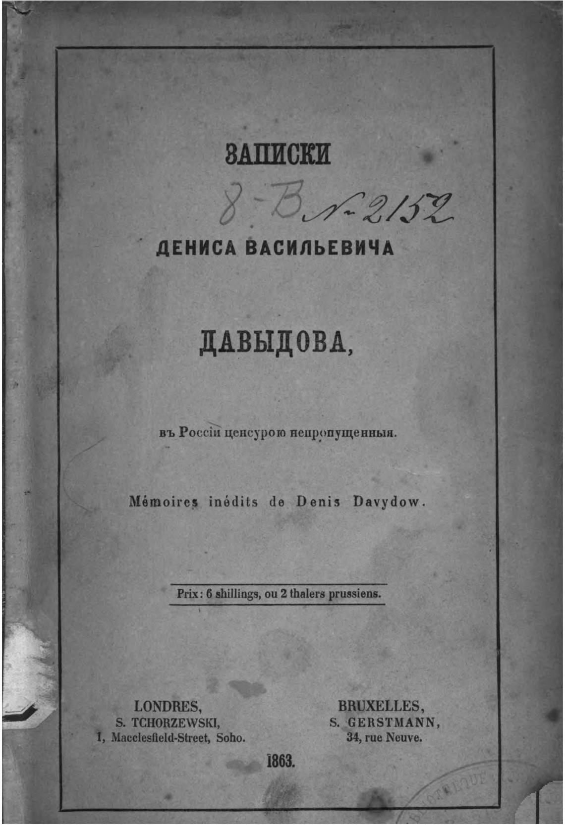 Prix: 6 shillings, ои 2 thalers prussiens.