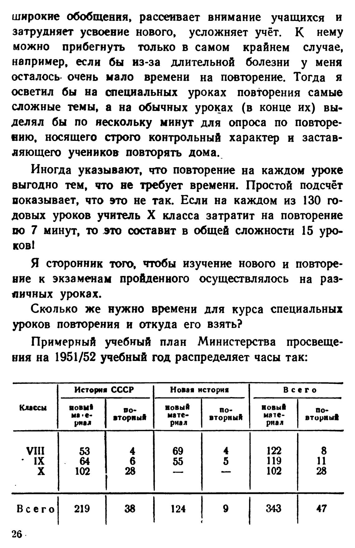 ния на 1951/52 учебный год распределяет часы так: