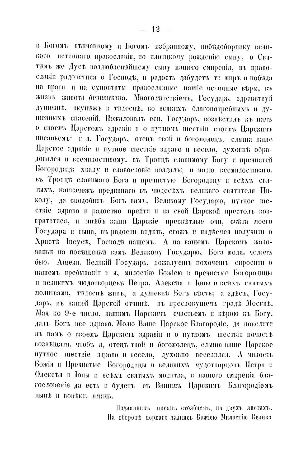 птсвпых'ь спасент. Пожаловалъ еси. Государь, возв•встплъ кь намъ