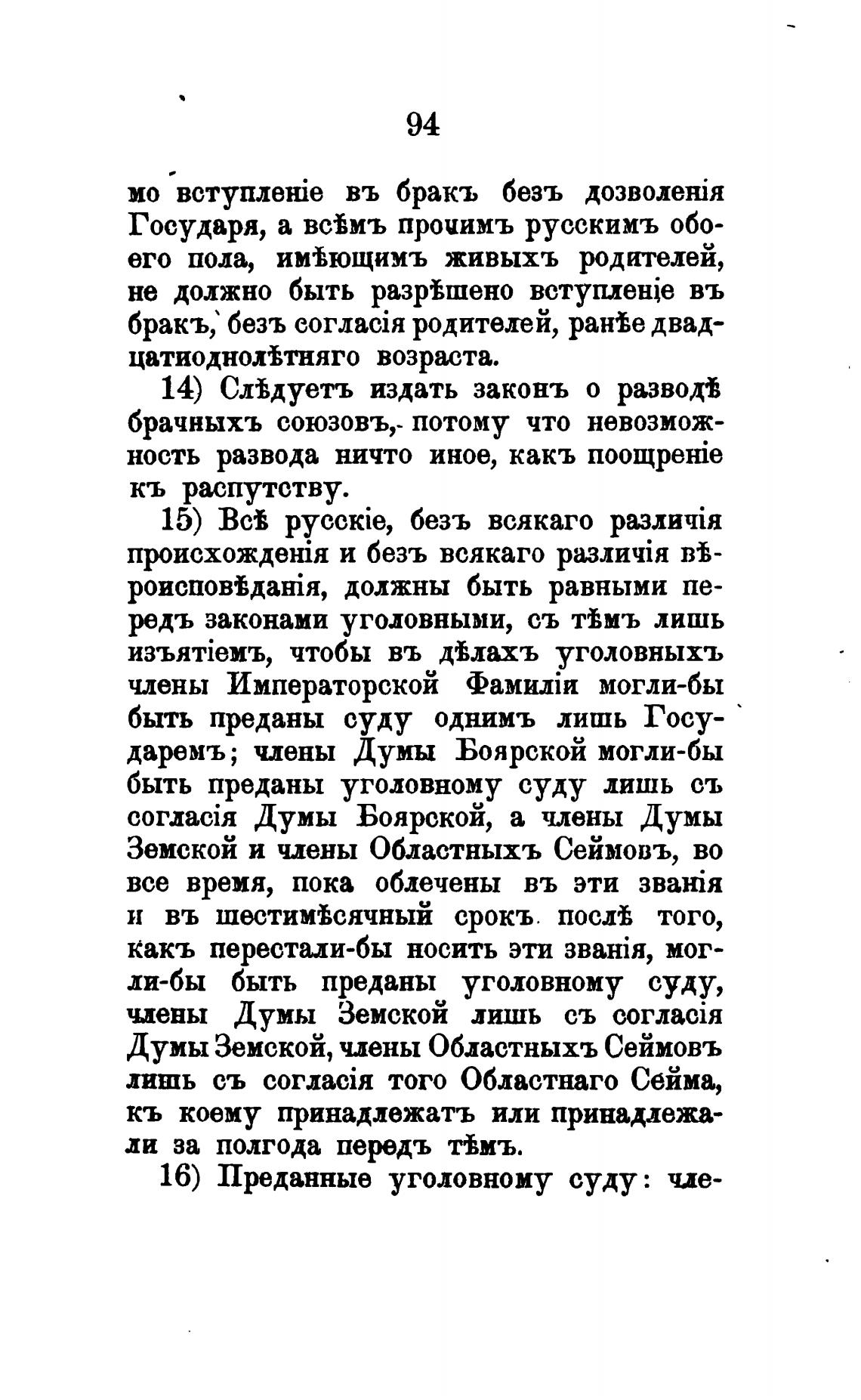 14) Слыуетъ издать законъ о разводј