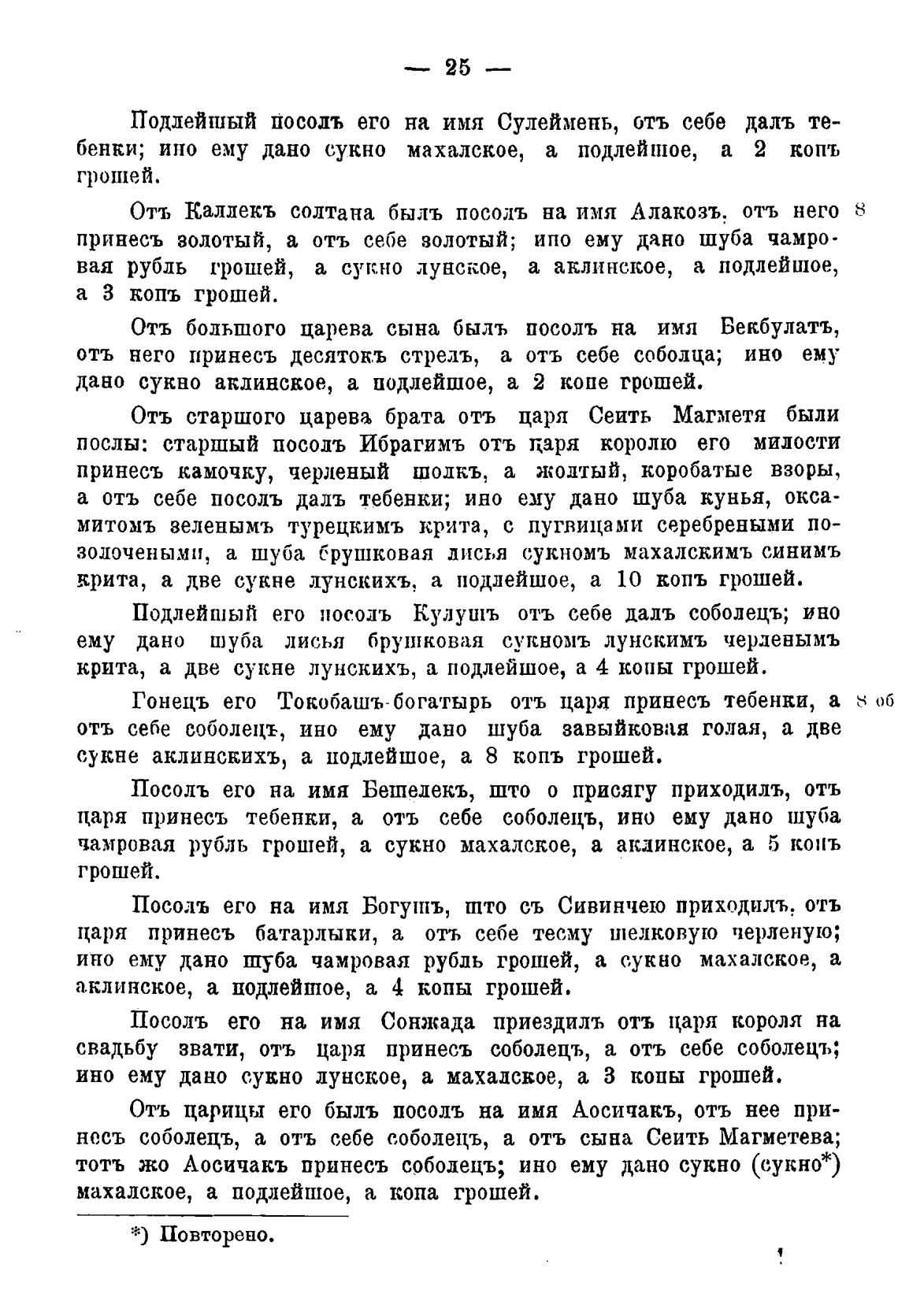 Отъ Каллекъ солтана быль посоль на имя Алакозъ. отъ него 8